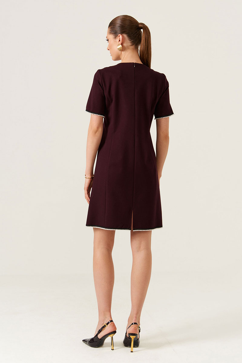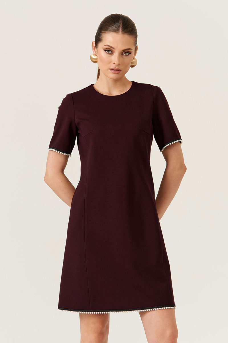 Особое внимание привлекает декоративная тесьма с контрастным жемчугом, которая украшает низ рукавов и подол платья, делая его особенно стильным и модным. Такое решение добавляет