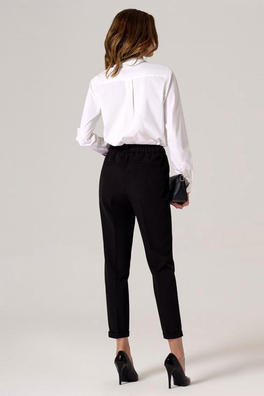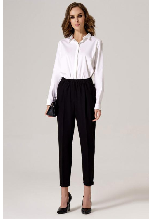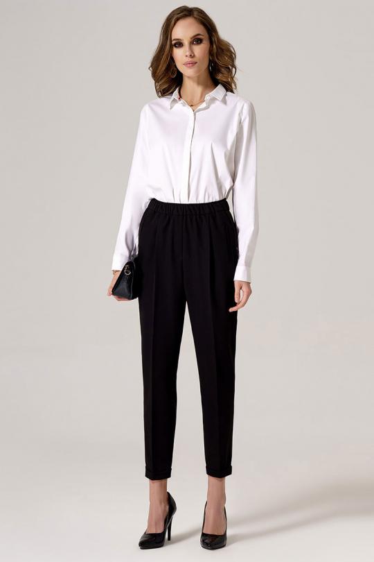 Стильные зауженные брюки длиной до щиколотки. По низу отложные манжеты. Брюки на резинке по талии. На передних и на задних частях брюк имеются карманы, по переду от пояса декоративные складочки. Отличный вариант брюк как на каждый день, так и для торжественных случаев.