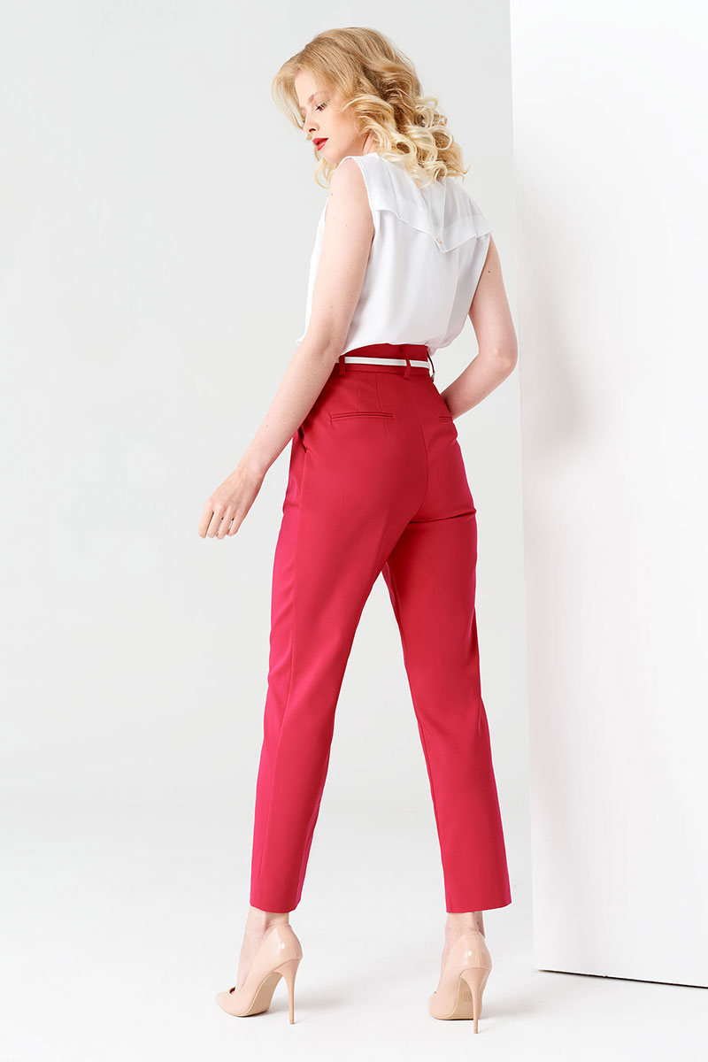 Стильные брюки из хлопковой ткани с высокой посадкой на талии. Брюки на поясе, зауженные к низу, по бокам разрезы. Передняя часть брюк со складками, идущими от пояса, задняя часть брюк с вытачками. По бокам карманы. Такие брюки отлично сочетаются с различными блузками, жакетами, джемперами, создавая стильный образ сегодняшнего дня.