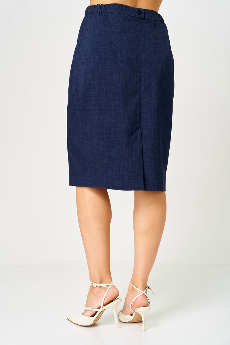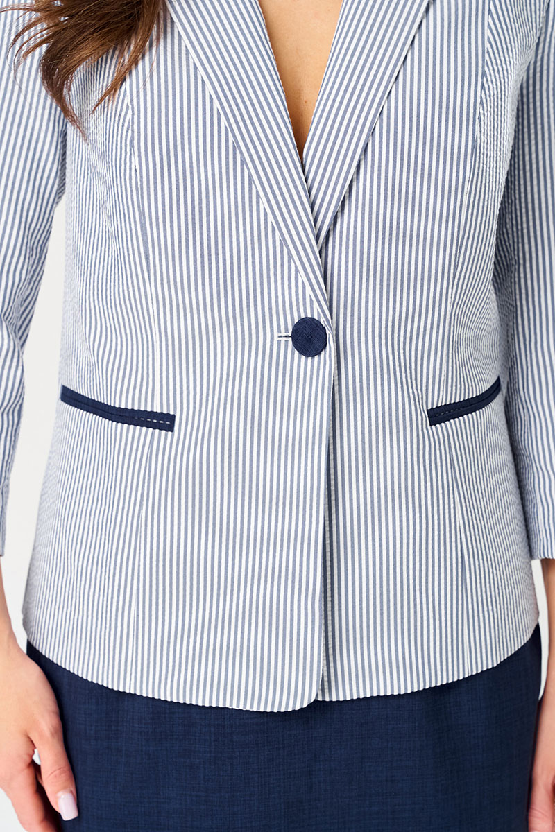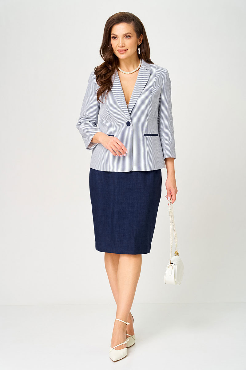 Этот женский костюм выполнен из смесовой ткани с добавлением хлопка, что обеспечивает комфорт и долговечность. Он включает в себя жакет и юбку, гармонично сочетающиеся по стилю и цвету. Жакет полуприлегающего силуэта в бело-синем оттенке с полосатым узором. Застежка в жакете центральная бортовая на обметанную петлю и обтяжную пуговицу, которая создает аккуратный и завершенный вид. Передняя часть оформлена двумя вертикальными рельефами, начиная от плечевого шва и доходящая до линии низа, что придает фигуре элегантную форму. На передней части расположены два прорезных кармана в рамку с обтачками и вставками из синей ткани, добавляющими интересный акцент. Спинка жакета украшена двумя вертикальными рельефами и средним швом, а также имеет тонкий разрез по шву для удобства. Воротник выполнен в пиджачном стиле, что делает модель более строгой и классической. Рукава втачные длиной ¾, что придает образу деловой нотки и комфорт при носке. Жакет на хлопковой подкладке. Юбка чуть расширена к низу, создавая женственный силуэт. Верхняя часть юбки обработана притачным поясом с вставкой на резинке в боковом шве, обеспечивая хорошую посадку и комфорт. Застежка выполнена на обметанную петлю и пуговицу, а также дополнена потайной молнией в среднем шве. Переднее полотнище юбки украшено двумя талиевыми вытачками, а заднее — двумя такими же вытачками и небольшим разрезом для удобства движений в среднем шве. Это стильный и элегантный костюм бело-синего оттенка, идеально подходящий для деловых встреч и повседневных мероприятий, сочетающий в себе классические линии и современный дизайн.