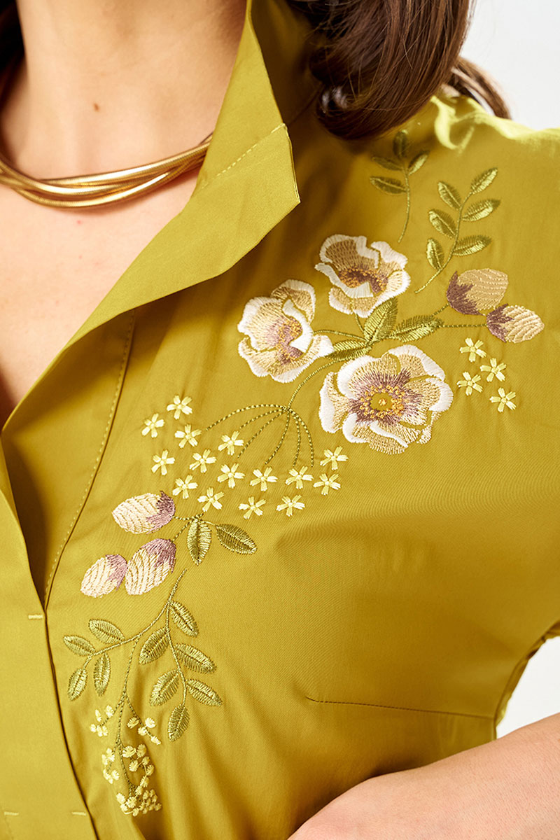 Платье женское из смесовой ткани для повседневной носки. Платье, расширенное к низу, а также отрезное по линии талии и имеет сборку. Перед имеет дизайнерскую вышивку в виде очаровательных цветов, а также две нагрудные вытачки. В боковом шве имеются потайные прорезные карманы. Горловина обработана втачной планкой и стойкой. Рукава цельнокроеные, низ рукава обработан отлетной манжетой, длинна рукава чуть выше локтя. Длинна платья макси. Для придания формы в области талии имеется пояс из основной ткани с застежкой на кнопки. В платье имеются по планке декоративные закрепки. Платье элегантного василькового цвета, в котором вы будете выглядеть очень привлекательно. За счет большого содержания хлопка в платье, ваша кожа будет чувствовать себя комфортно. Красивое и элегантное платье в котором вы будете выглядеть неотразимо.
