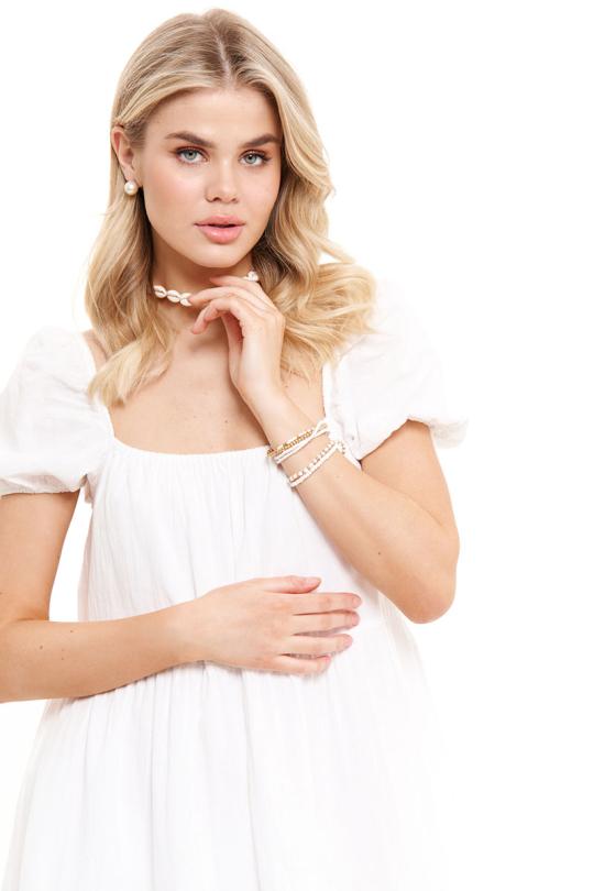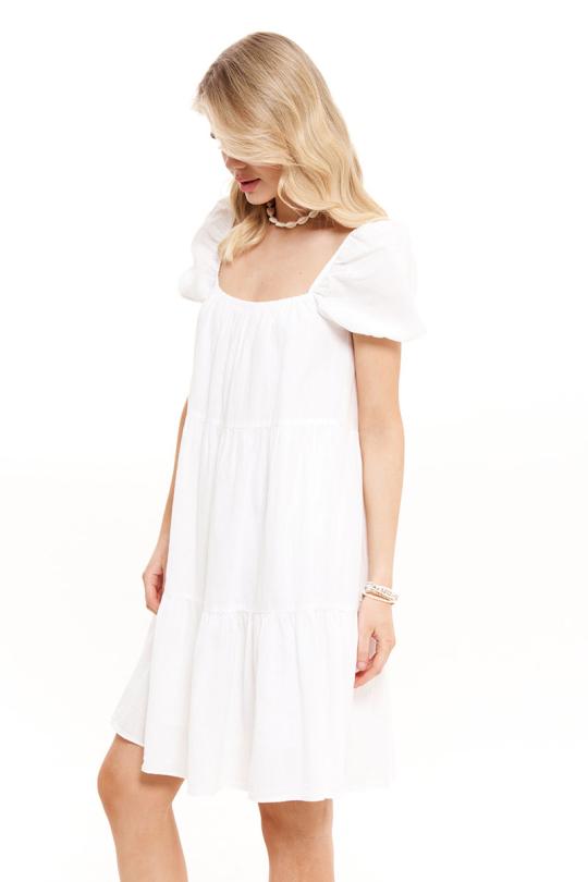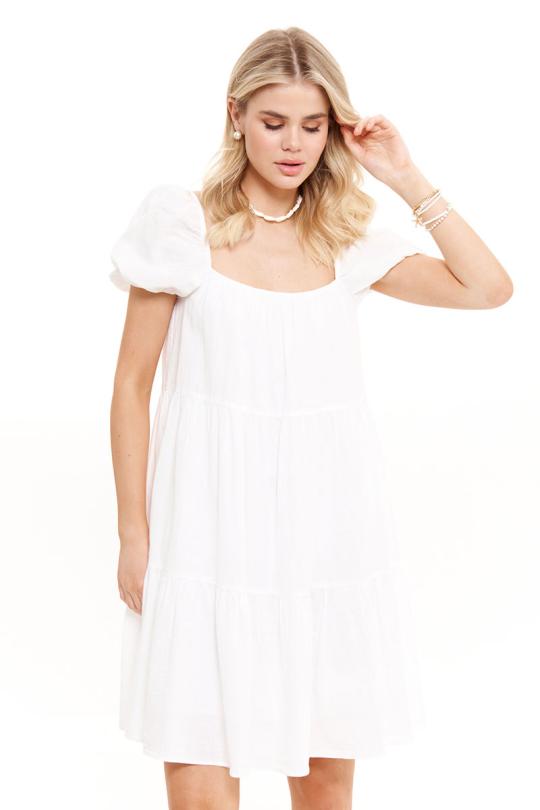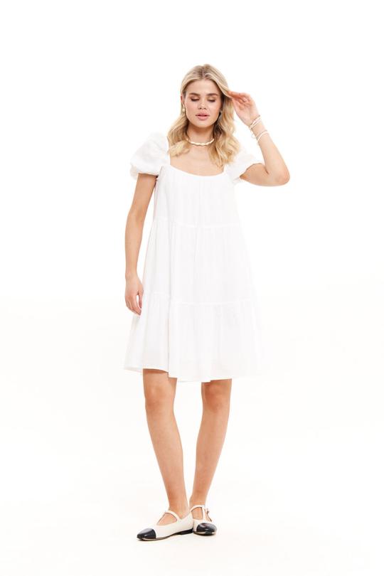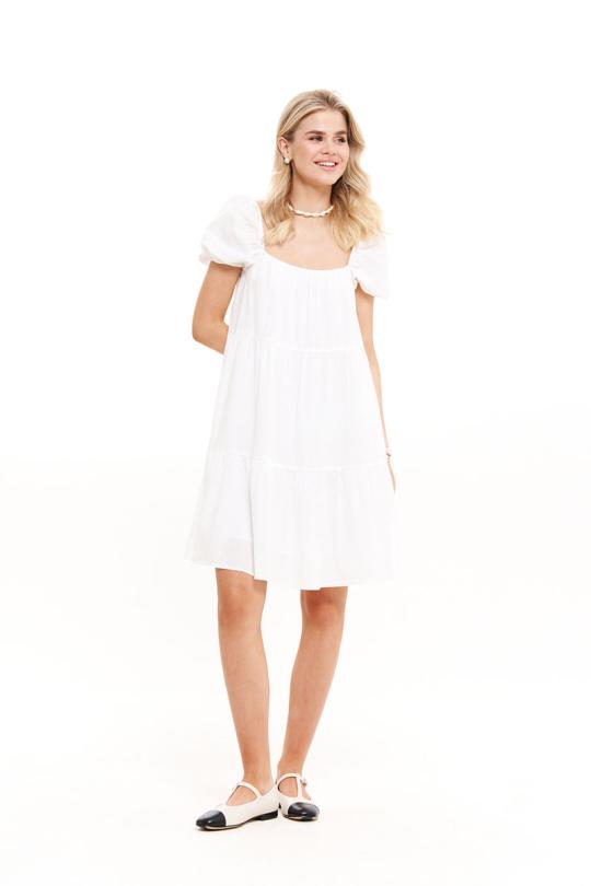 Платье женское из хлопчатобумажной подкладки для повседневной носки. Платье, расширенное к низу. платье отрезное чуть выше линии талии и по низу имея небольшую сборку. Горловина U-образная, на резинке. Рукава фонарики на резинке по плечевому шву и по низу. Платье на хлопчатобумажной подкладке. Длина платья чуть ниже колена. Очень лёгкое платье белого оттенка, которое безусловно должно быть у каждой девушки. В данном платье вы будете безупречно и обязательно будете ловить на себе восхищенные взгляды прохожих.
