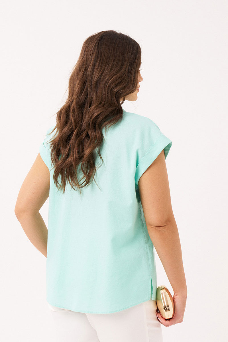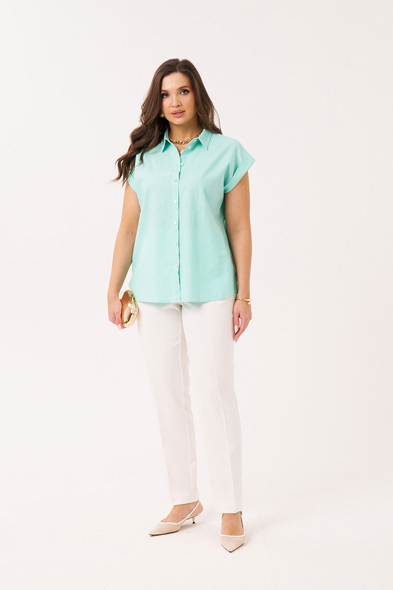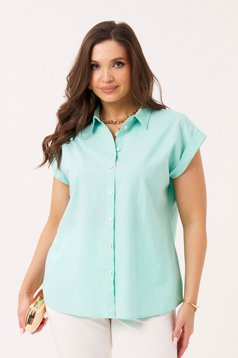 Летняя блузка - один из самых популярных предметов женской одежды. Рубашка выполнена из натуральной ткани в составе которой лён и хлопок. Модель свободного кроя. Горловина обработана воротником со стойкой. Застёжка сквозная на петли-пуговицы. Пройма слегка спущена, оформлена крылышком- манжетой. Удлиненная модель подойдет как для девушек, так и для взрослых женщин, и сделает вашу фигуру более изящной. Независимо от того, какой стиль вы предпочитаете, эта модная рубашка со спущенным рукавом станет отличным дополнением к вашему гардеробу. Выбирайте летнюю блузку в мятном цвете для создания стильных образов и чувства комфорта в любое время года!
