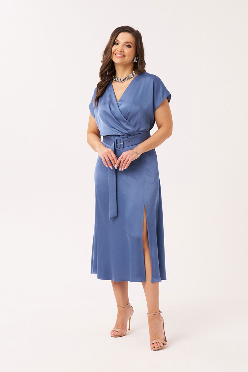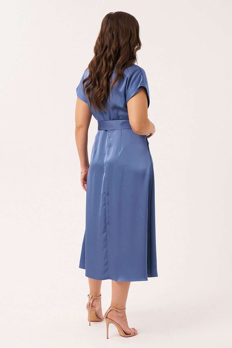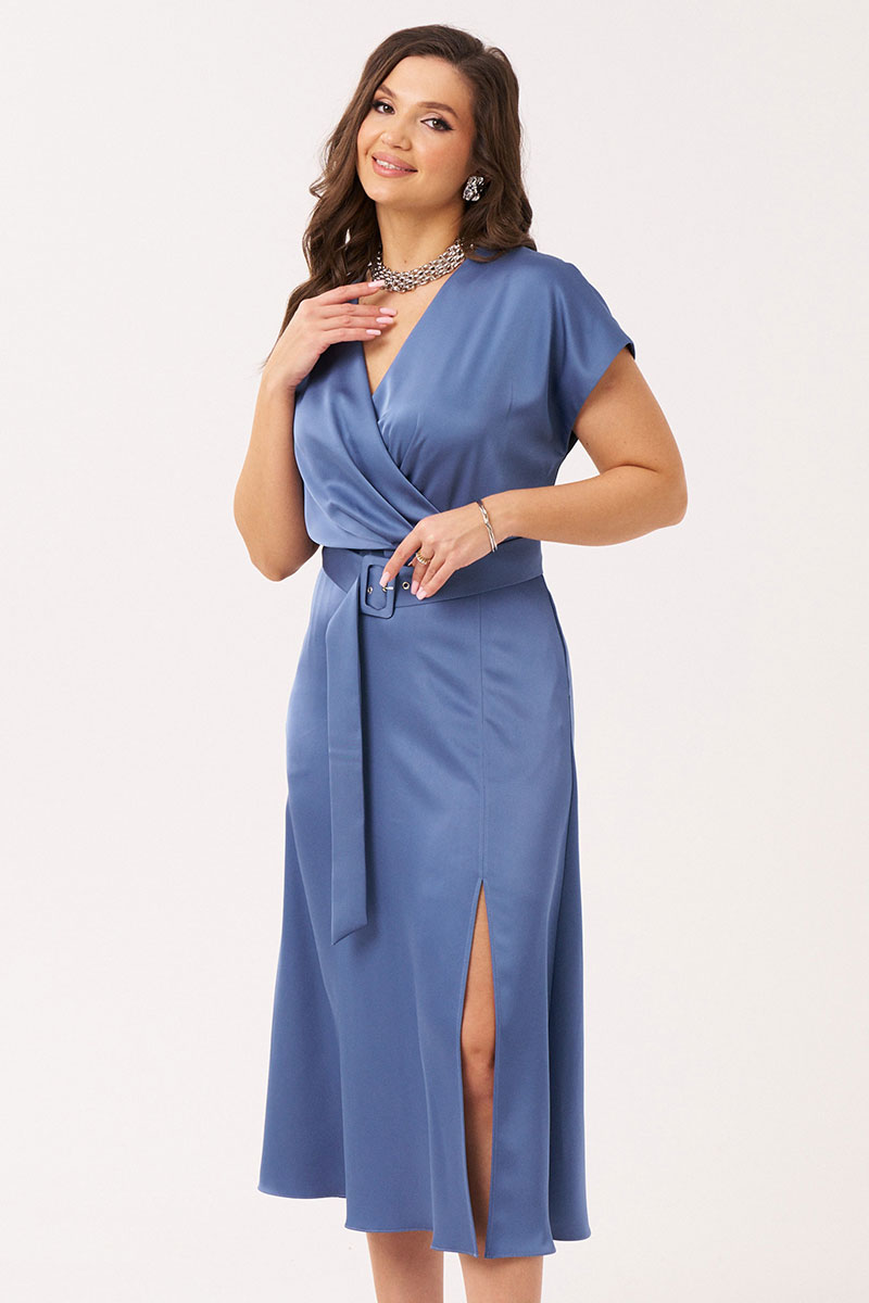Платье женское из струящейся ткани для торжественной носки. Платье полуприлегающего силуэта. Платье на запах, а также отрезное по линии талии. Лиф переда имеет складки. Лиф спинки имеет две талиевые вытачки и средний шов. Горловина V-образная. Рукава цельнокроеные, короткие. Юбка платья, расширенная к низу. Переднее полотнище юбки имеет разрез в шве, который который выходит на колено.Заднее полотнище юбки со средним швом и двумя вытачками. Платье длиной миди. Данная модель платья в элегантном тёмно-голубом цвете покорит вас своей красотой и великолепной посадкой. В данном платье вы будете выглядеть неотразимо и будете ловить на себе восхищенные взгляды.
