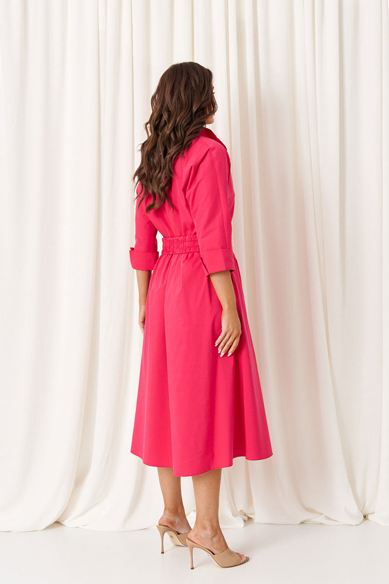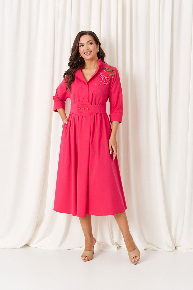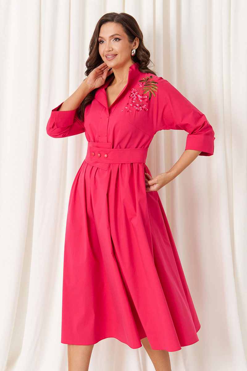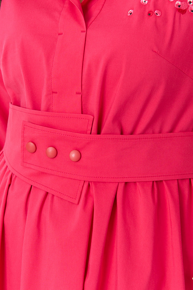Платье женское из хлопковой ткани для повседневной носки. Без подкладки. Платье полуприлегающего силуэта. Платье отрезное по линии талии и имеет небольшую сборку. Перед имеет две нагрудные вытачки, а также дизайнерскую вышивку в виде веточки рябины. В боковых швах располагаются прорезные карманы. Горловина обработана втачной планкой с нахлестом в V-образной горловине, а также воротником-стойкой. Рукава втачные, длиной. ниже локтя. Низ рукава обработан отлетной манжетой. Юбка платья расширенная. Платье укомплектовано поясом из основной ткани изделия. Пояс со вставкой на резинке, застежка на кнопки. Длина изделия миди. Данное платье красного оттенка станет незаменимой вещью в вашем гардеробе, оно отлично будет сидеть и смотреться на любой фигуре.