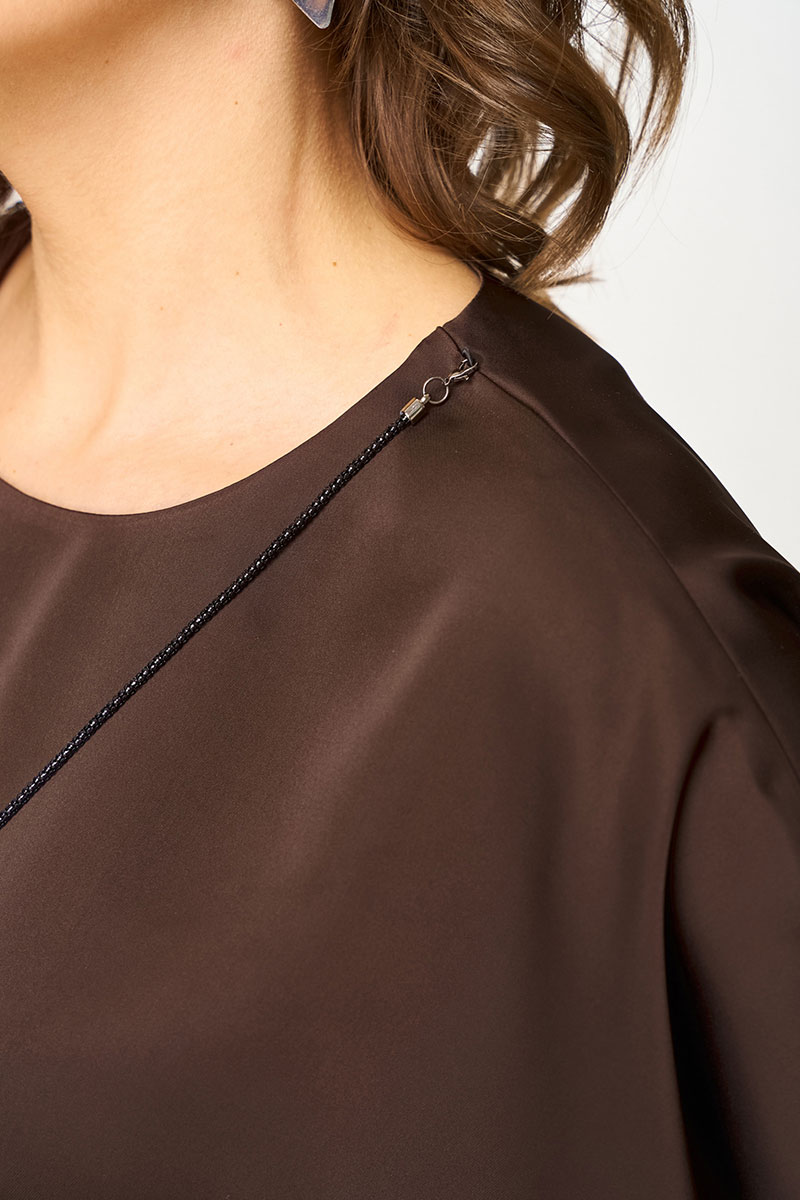 Женская блузка выполнена из струящейся ткани, которая красиво драпируется по фигуре, обеспечивая комфорт и подчеркивая элегантность. Черная окантовка горловины и рукавов в фасоне "летучая мышь" придают модели завершенный вид. Съемная декоративная цепь на груди и застежка-капелька на спинке добавляют оригинальности.