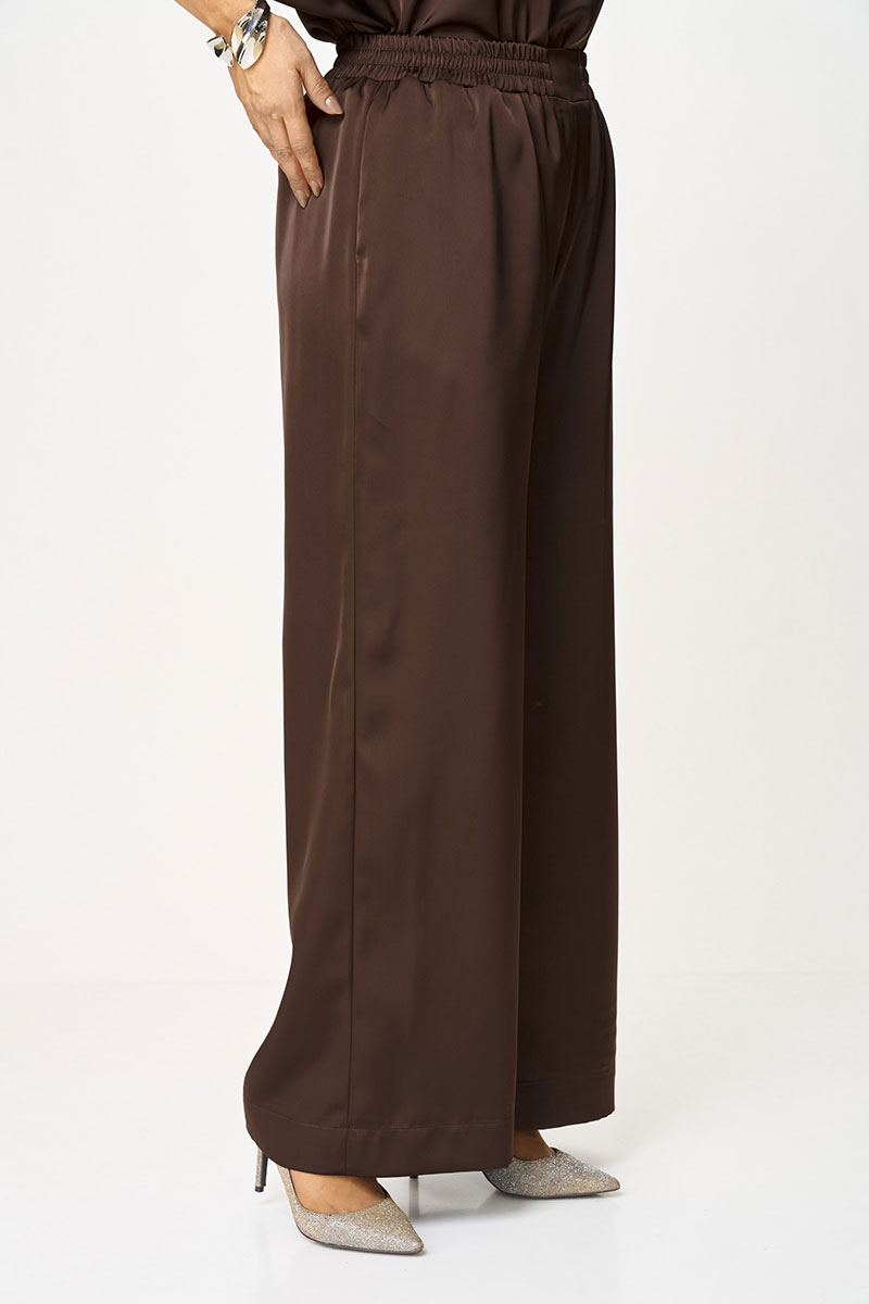 Атласный блеск брюк делает костюм праздничным и утонченным, отлично подходящим как для офисных встреч, так и для вечерних мероприятий. Пояс брюк на резинке обеспечивает удобную посадку, а потайные боковые карманы — дополнительный комфорт.
