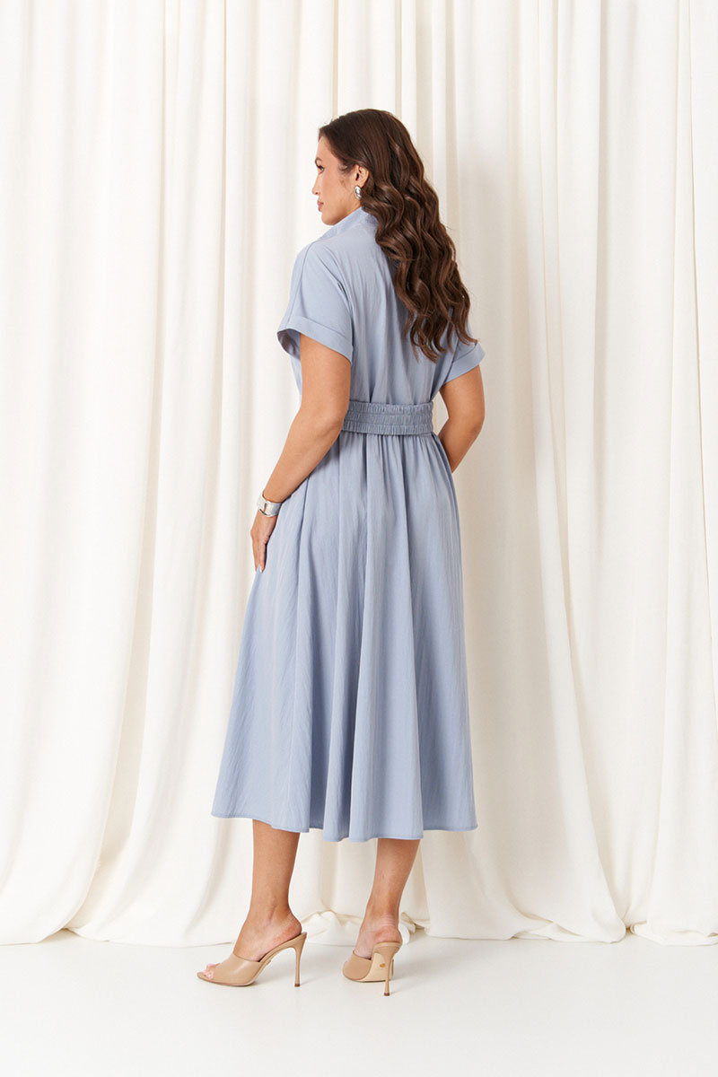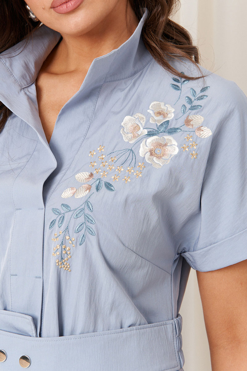 Платье женское из смесовой ткани для повседневной носки. Платье, расширенное к низу, а также отрезное по линии талии и имеет сборку. Перед имеет дизайнерскую вышивку в виде очаровательных цветов, а также две нагрудные вытачки. В боковом шве имеются потайные прорезные карманы. Горловина обработана втачной планкой и стойкой. Рукава цельнокроеные, низ рукава обработан отлетной манжетой, длинна рукава чуть выше локтя. Длинна платья макси. Для придания формы в области талии имеется пояс из основной ткани с застежкой на кнопки. В платье имеются по планке декоративные закрепки. Платье элегантного серо-голубого цвета, в котором вы будете выглядеть очень привлекательно. За счет большого содержания хлопка в платье, ваша кожа будет чувствовать себя комфортно. Красивое и элегантное платье в котором вы будете выглядеть неотразимо.