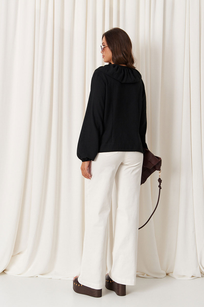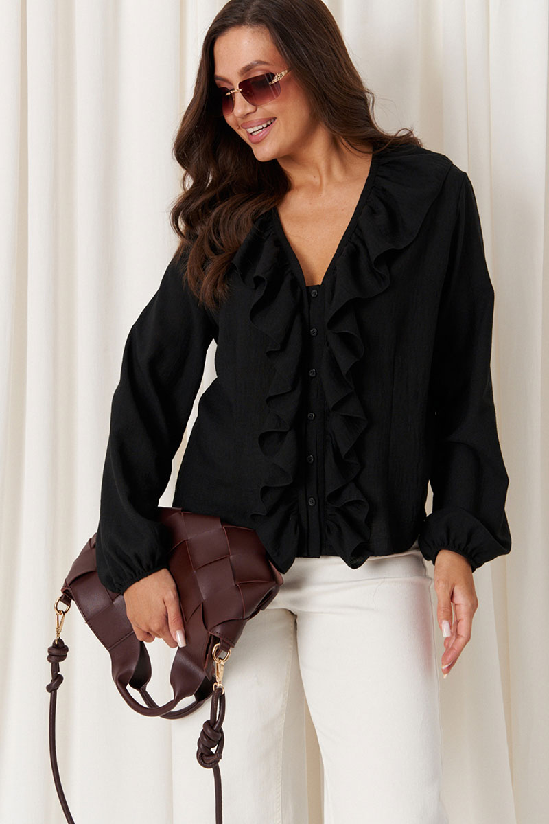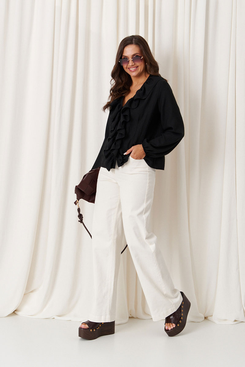 Женская блузка с большим дополнением хлопка прямого силуэта, чёрного цвета. Легкая и воздушная блузка, идеально подходящая для повседневной носки. Модель обладает прямым силуэтом и комфортной посадкой. Застежка центральная на обметанные петли пуговицы. Перед украшен притачной тесьмой, идущей до низа изделия, с декоративными воланами вдоль планки, добавляющими женственности и изящности. Блузка завязывается на три завязки в нижней части. Горловина V-образная, тем самым обеспечивает дополнительный комфорт и элегантность. Длинные втачные рукава с низом, обработанным на резинке со сборкой, придают модели легкий и немного романтичный образ. Это универсальный базовый вариант, прекрасно сочетающийся с разными гардеробными элементами и создающий стильный образ в любой ситуации.