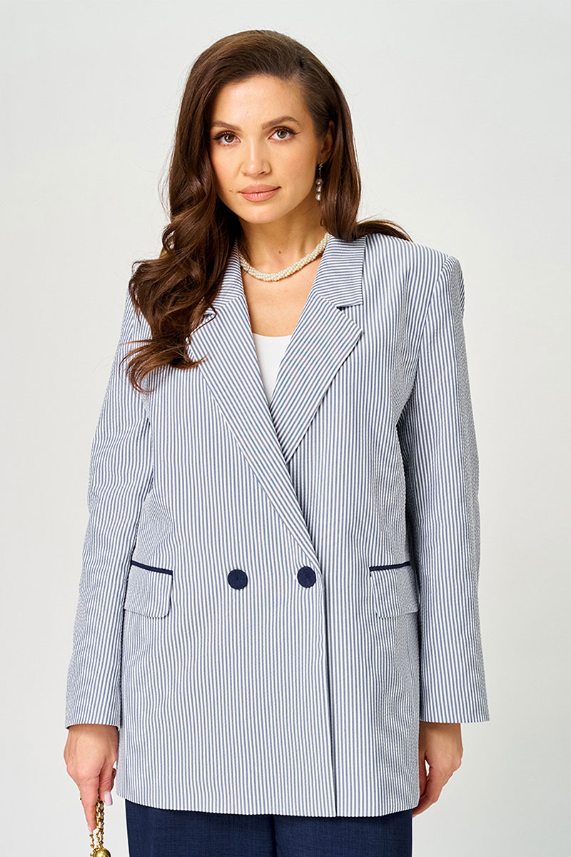 Этот женский костюм выполнен из смесовой ткани с добавлением хлопка, что обеспечивает комфорт и долговечность. Он включает в себя жакет и брюки, гармонично сочетающиеся по стилю и цвету. Жакет полуприлегающего силуэта в бело-синем оттенке с полосатым узором. Застежка в жакете двубортная на обметанные петли и обтяжные пуговицы, которые создают аккуратный и завершенный вид. На переде расположены два прорезных кармана в рамку с двумя обтачками и клапаном, и вставками из синей ткани, добавляющими интересный акцент. Спинка жакета украшена двумя средним швом. Жакет имеет бочок. Воротник выполнен в пиджачном стиле, что делает модель более строгой и классической. Рукава втачные длинные что придает образу деловой нотки и комфорт при носке. Жакет на хлопковой подкладке. Брюки прямые из смесовой ткани с добавлением льна. Верхний срез брюк обработан притачным поясом с вставкой на резинке в боковой и задней части, обеспечивая хорошую посадку и комфорт. В боковом шве имеются карманы с подкройным бочком. Это стильный и элегантный костюм бело-синего оттенка, идеально подходящий для деловых встреч и повседневных мероприятий, сочетающий в себе классические линии и современный дизайн.