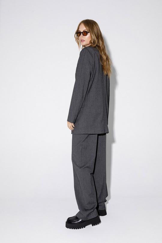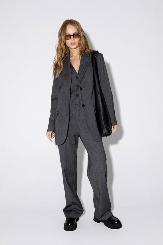 Костюм-двойка из свободного жакета и прямых брюк со стрелками из текстильной ткани с рисунком «ёлочка».