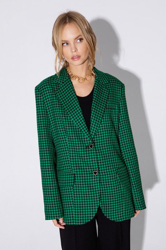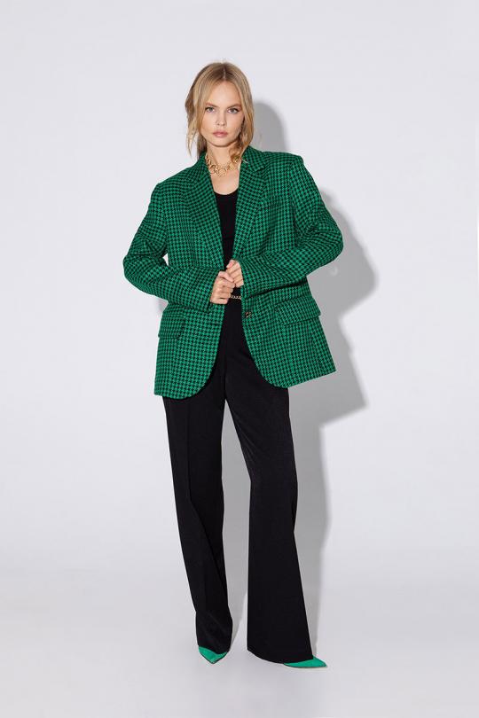 Детали: жакет прямого силуэта, расширенная линия плеч, пиджачный воротник, перед с прорезными функциональными карманами, однобортная застежка на петли и пуговицы, спинка со средним швом и шлицей, рукава втачные двухшовные, жакет на подкладке.