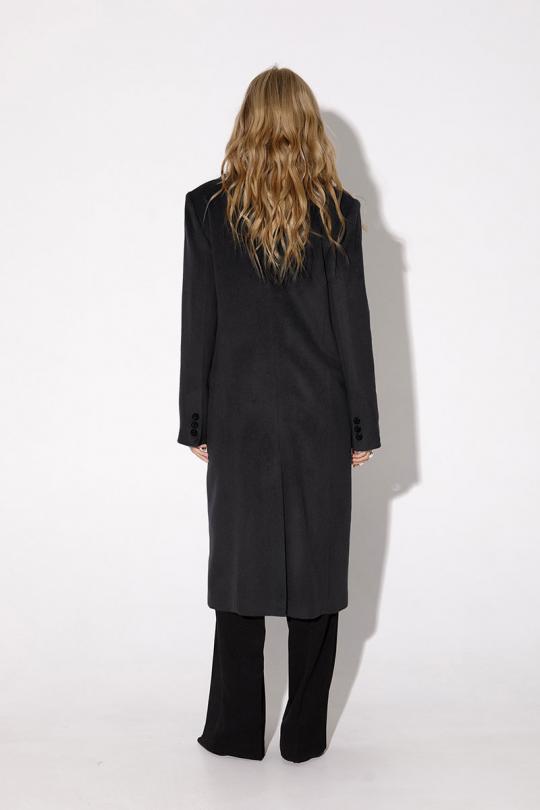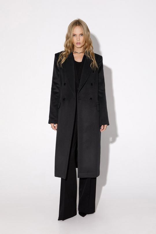 Двубортное пальто со шлицей. Детали: полуприлегающий силуэт, талиевые вытачки, пиджачный воротник, перед с прорезными карманами с клапанами, отрезные бочки, застежка на петли и декоративные пуговицы, спинка со средним швом, втачные длинные рукава со шлицей, пальто на подкладке.