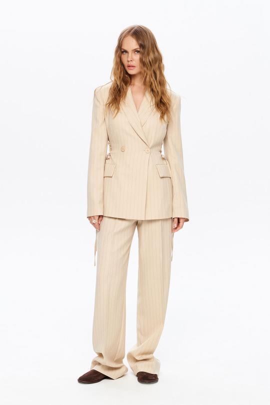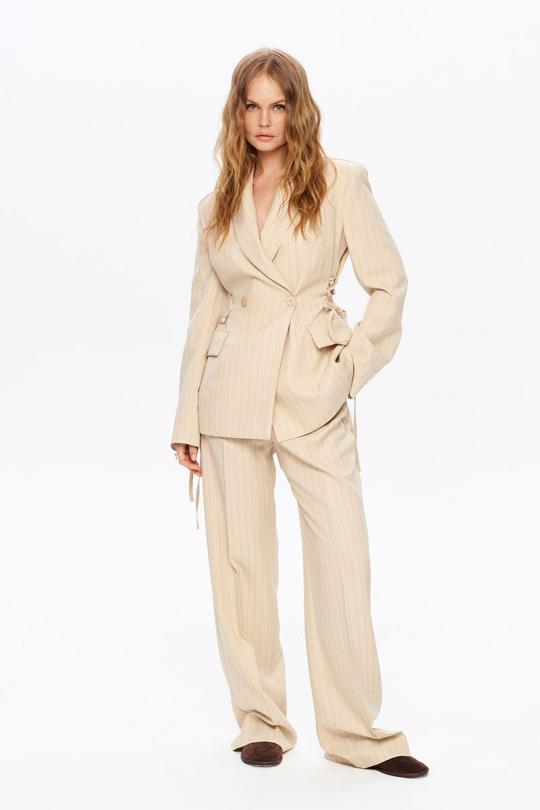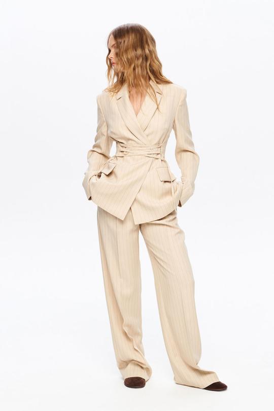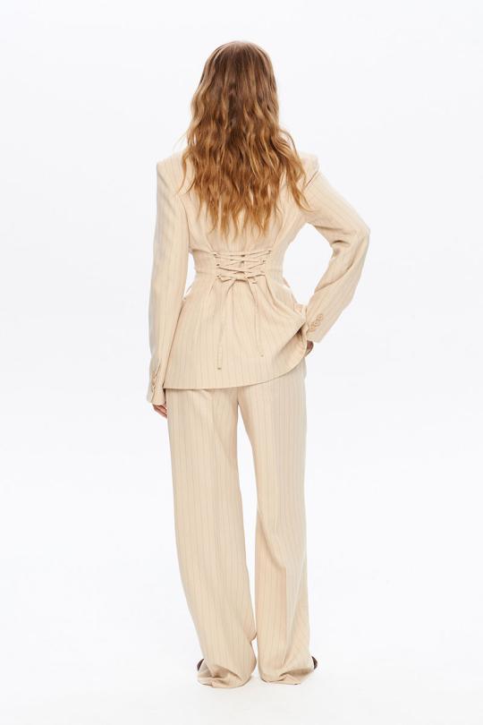 Костюм-двойка из жакета со шнуровкой с расширенной линией плеч и широких прямых брюк со стрелками из текстильной ткани в полоску.