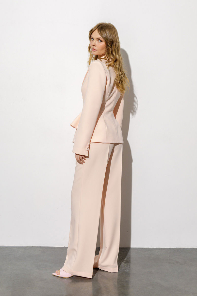 Текстильный костюм-двойка из приталенного жакета и прямых широких брюк со стрелками.