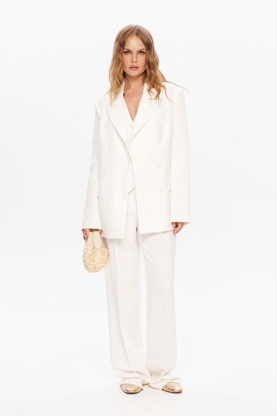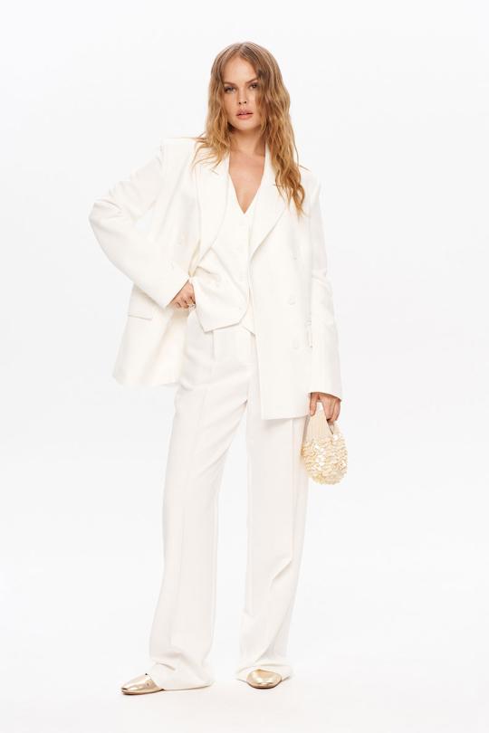 Текстильный костюм-двойка из свободного жакета и прямых широких брюк со стрелками.