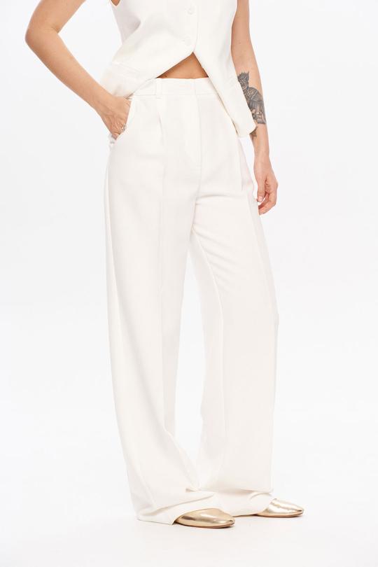 Брюки с высокой посадкой, притачной пояс со шлевками, передние половины с небольшими застроченными мягкими складками и заутюженными стрелками, застежка на молнию и пуговицу, боковые карманы. Задние части брюк с вытачками и заутюженными стрелками. Пояс брюк прямой, без резинки.