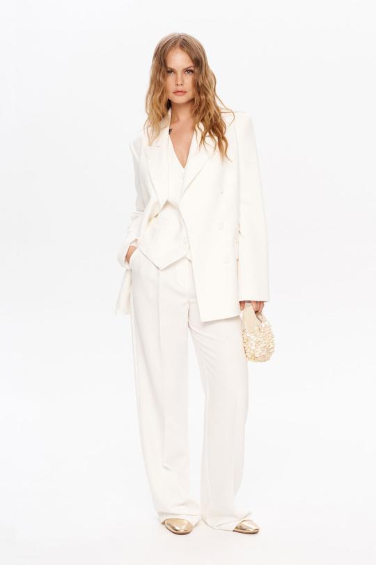 Текстильный костюм-тройка из свободного жакета, полуприлегающего жилета и прямых широких брюк со стрелками.