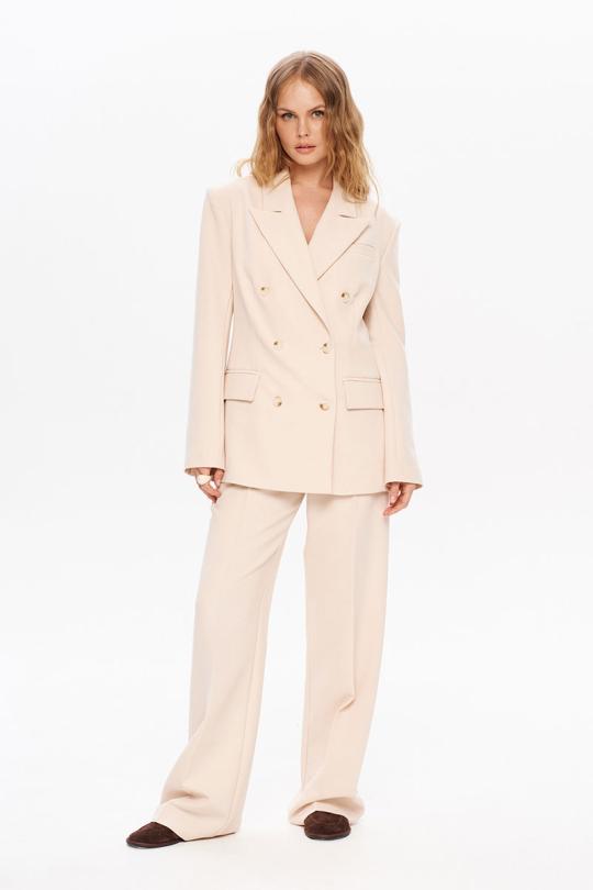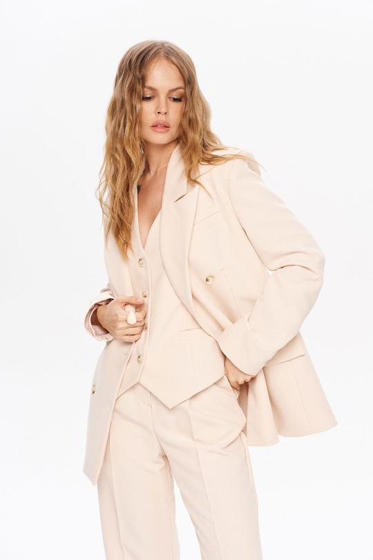 Детали: жакет свободного покроя и полуприлегающего силуэта, двубортная застежка на петли и пуговицы, отрезные бочки, пиджачный воротник, функциональные карманы, жакет на подкладке.