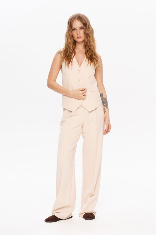 Брюки с высокой посадкой, притачной пояс со шлевками, передние половины с небольшими застроченными мягкими складками и заутюженными стрелками, застежка на молнию и пуговицу, боковые карманы. Задние части брюк с вытачками и заутюженными стрелками. Пояс брюк прямой, без резинки.