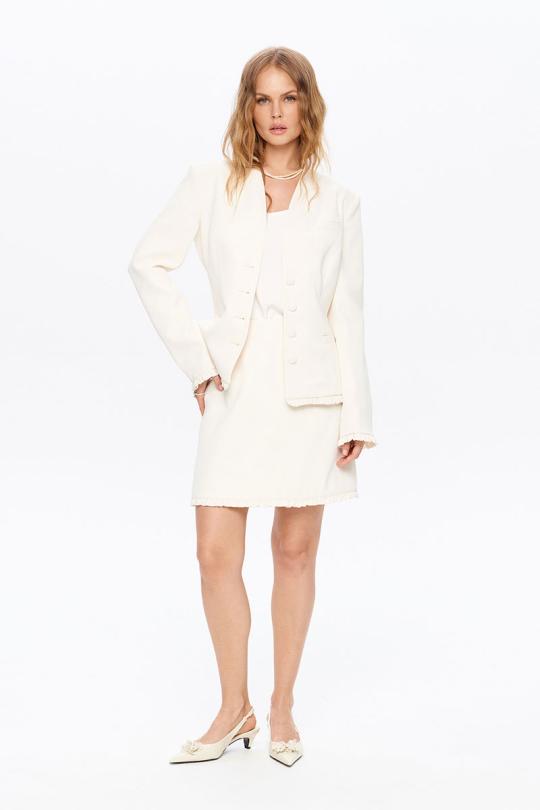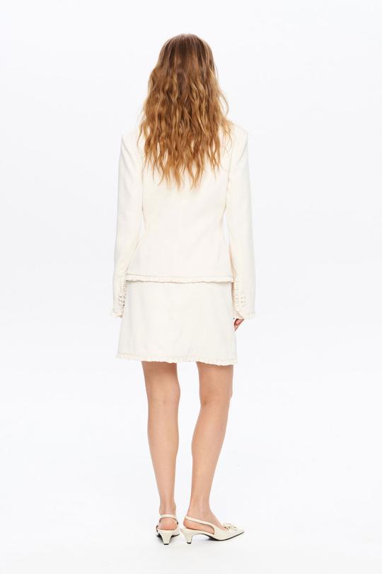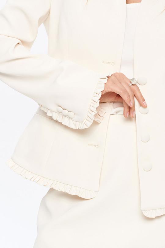 Костюм-двойка из приталенного жакета и мини-юбки с оборками.