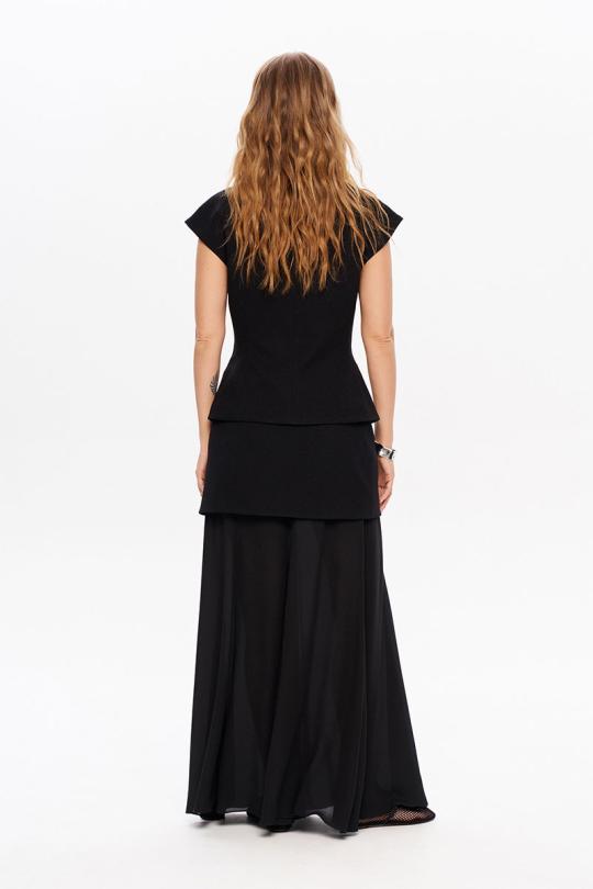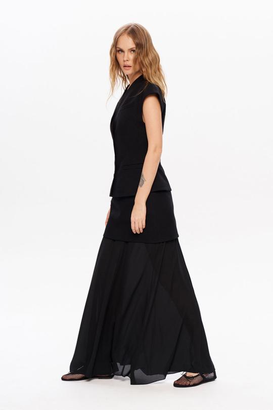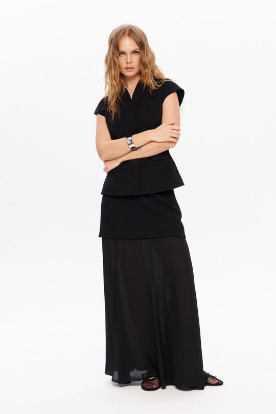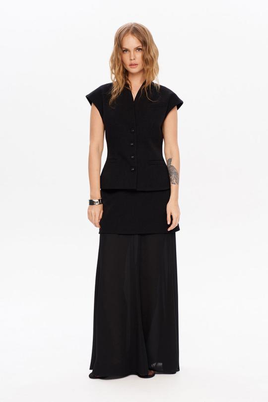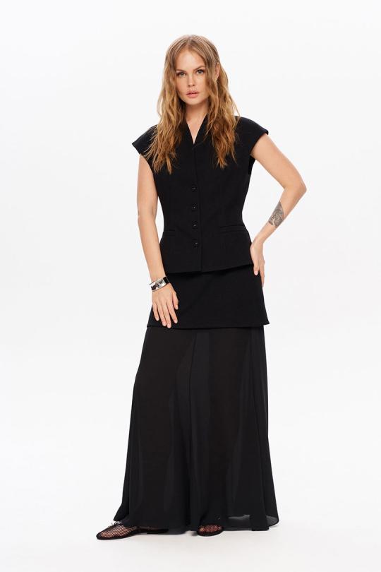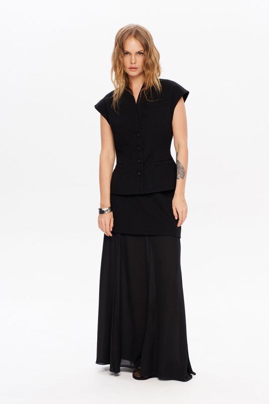 Костюм-двойка из приталенного жилета с воротником-стойкой и макси-юбки.