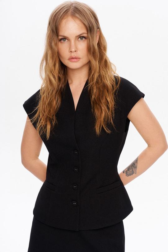 Детали: полуприлегающий силуэт, цельнокроеный воротник-стойка, рельефные швы переда и спинки, функциональные карманы, застежка на петли и пуговицы, жилет на подкладке.