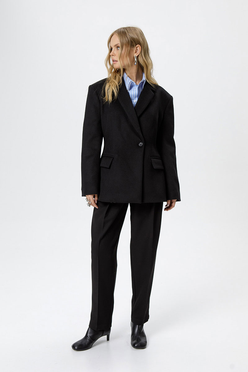 Детали: полуприлегающий силуэт, расширенные плечи, пиджачный воротник, талиевые вытачки переда и спинки, застежка на петли и пуговицы, функциональные карманы, на подкладке.