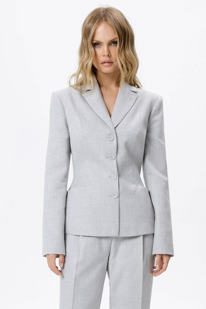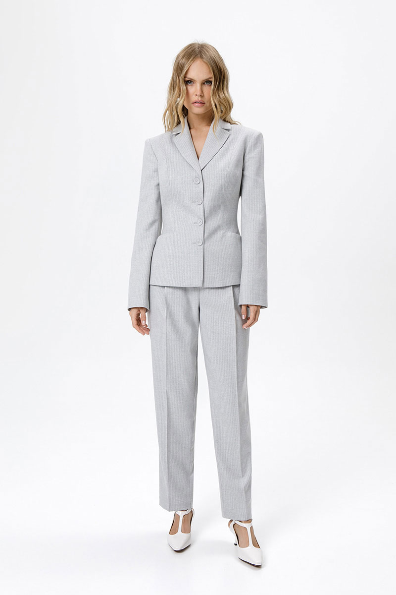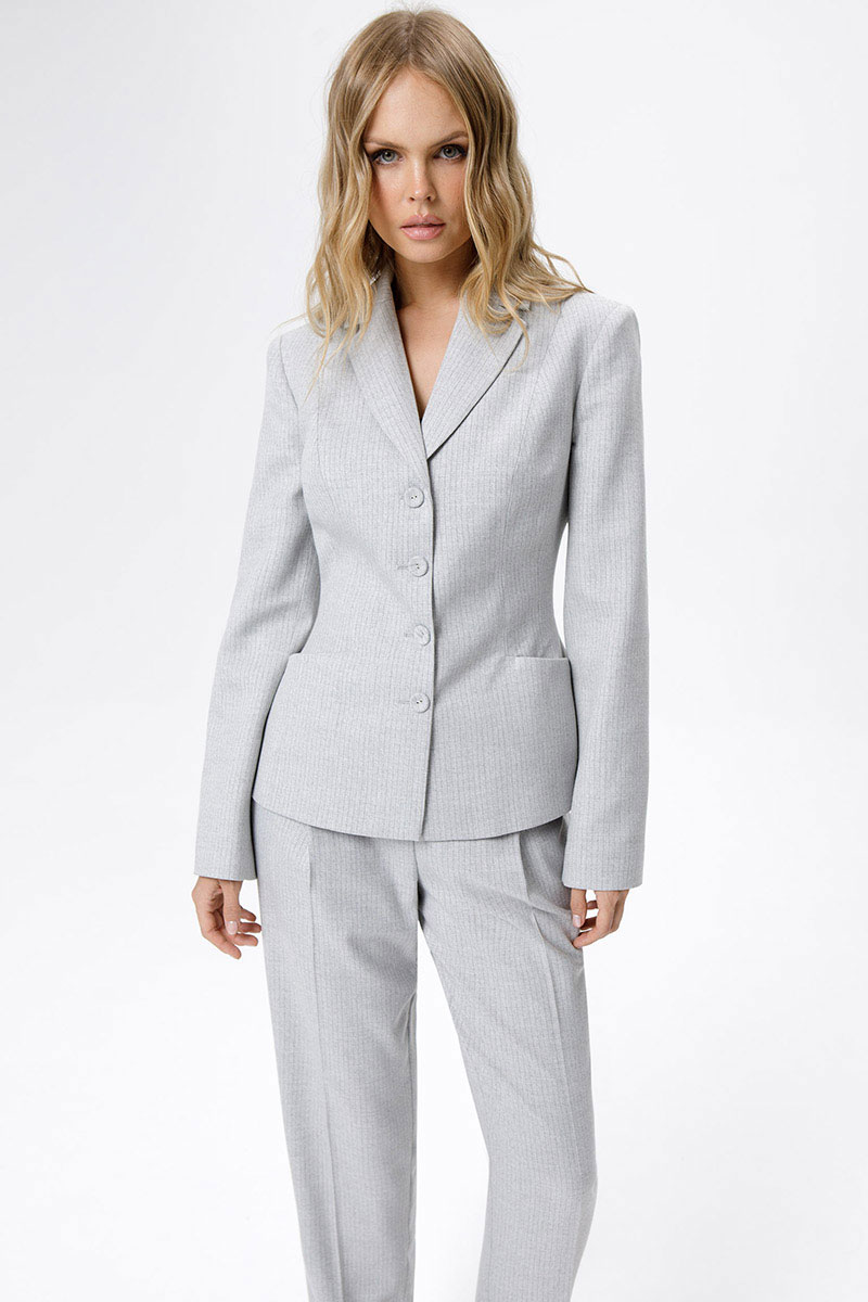 Костюм-двойка из укороченного приталенного жакета с акцентными карманами и укороченных классических брюк со стрелками.