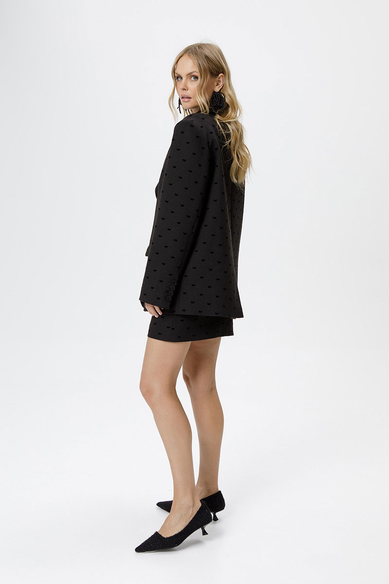 Костюм-двойка из оверсайз жакета и мини-юбки из костюмной ткани с бантиками из флока.