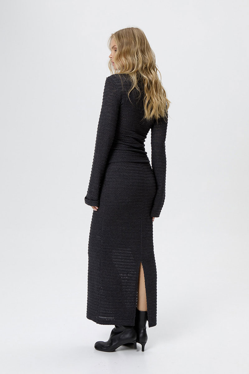 Костюм-двойка из джемпера с воротником-поло и миди-юбки из ажурного трикотажа.