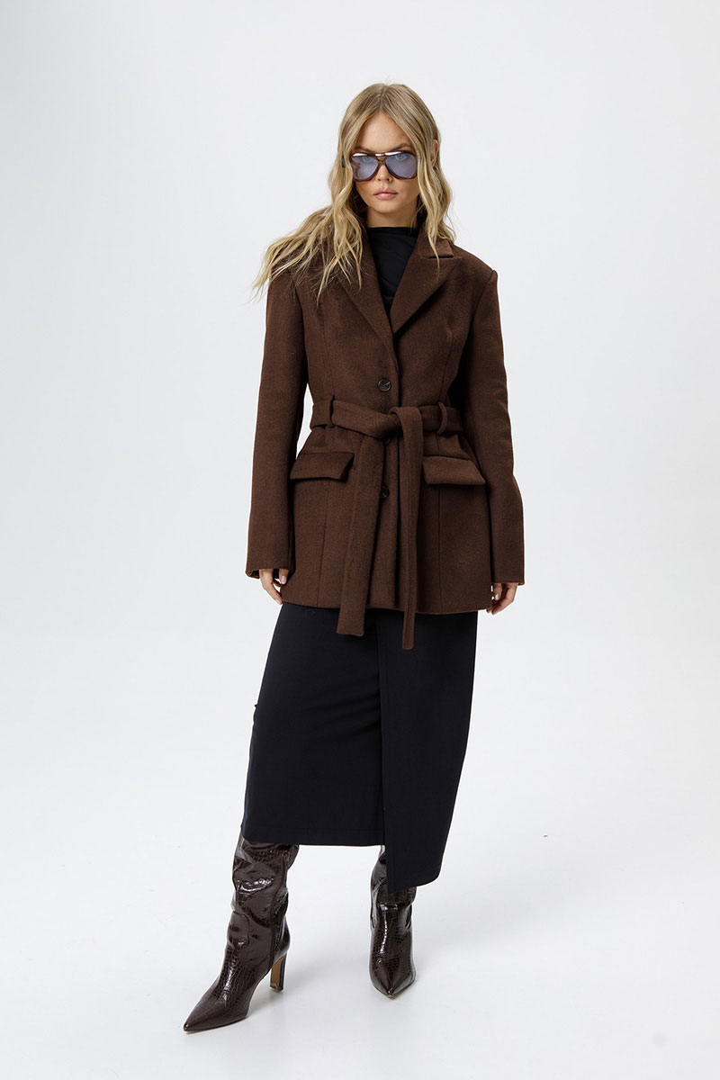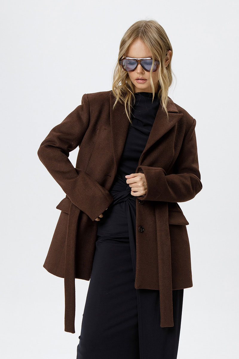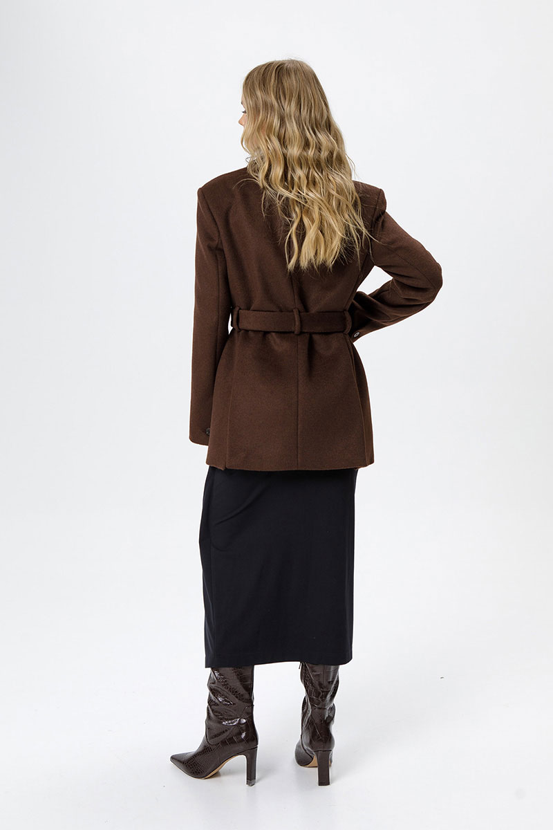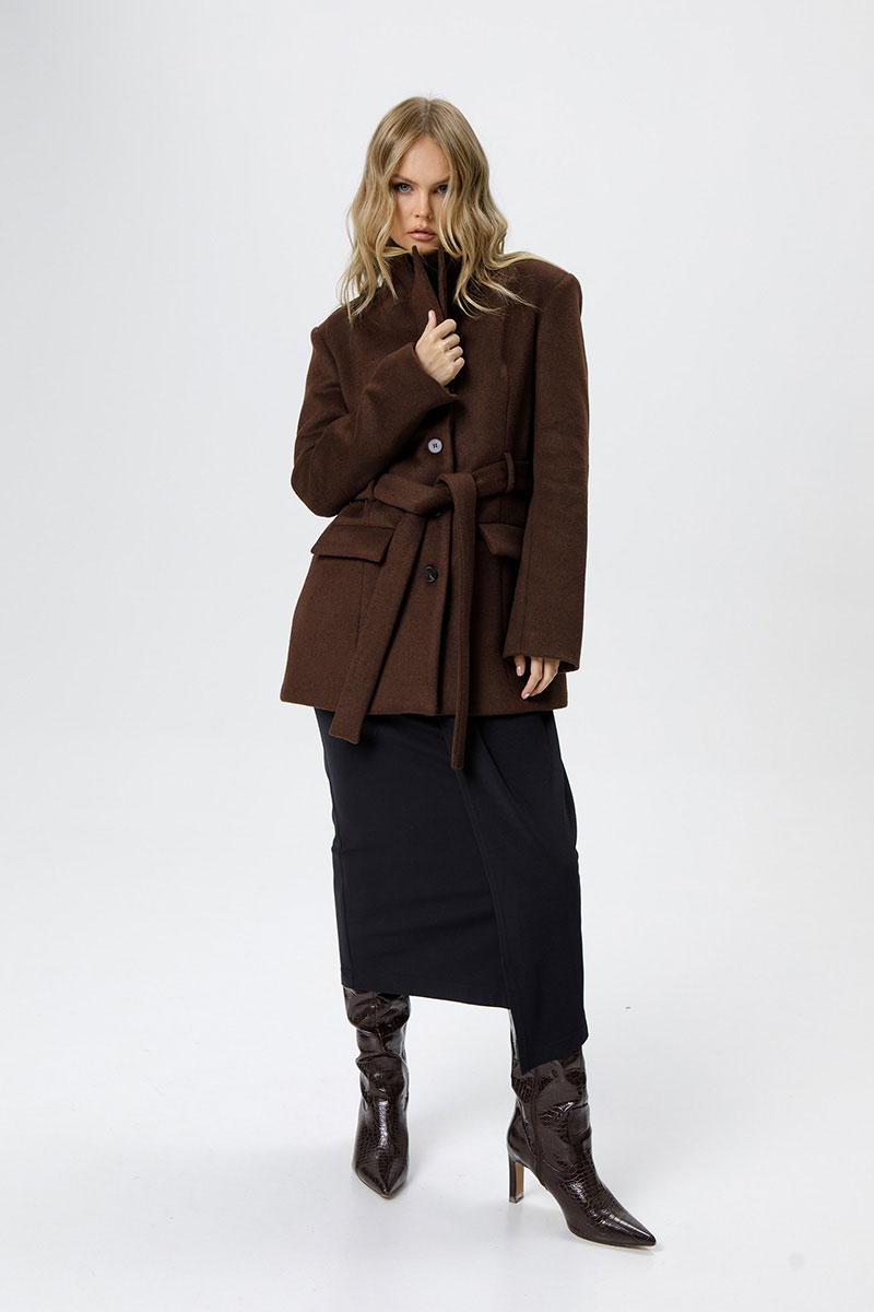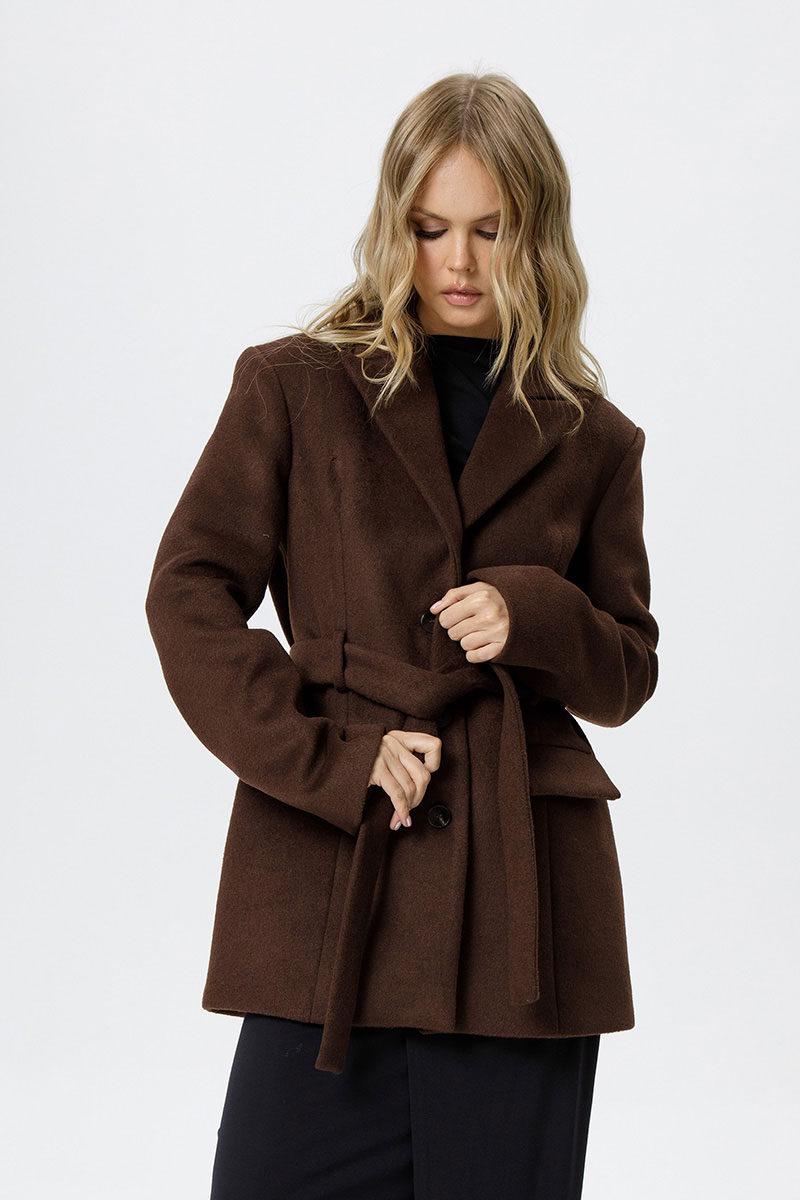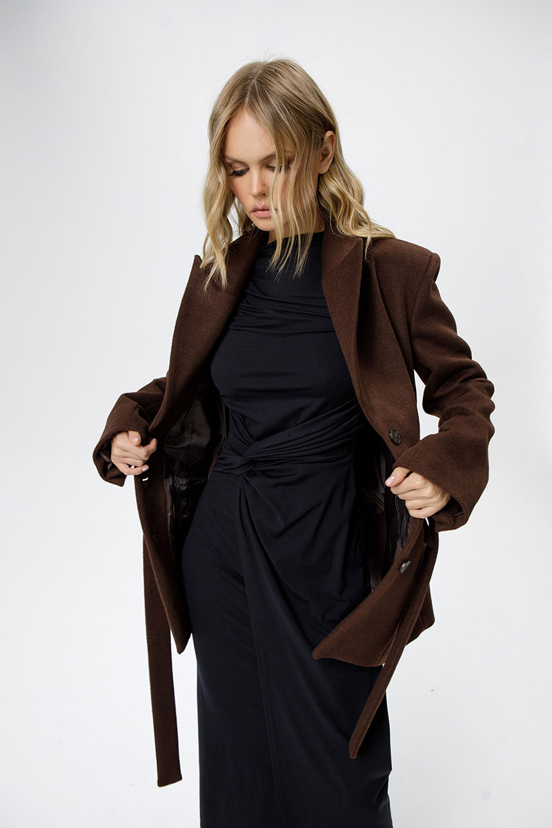 Детали: полуприталенный силуэт, перед с прорезными карманами с клапанами, талиевые вытачки по переду, спинка с рельефами, воротник пиджачного типа, застёжка центральная на петли и пуговицы, втачные длинные рукава, полупальто на подкладке.