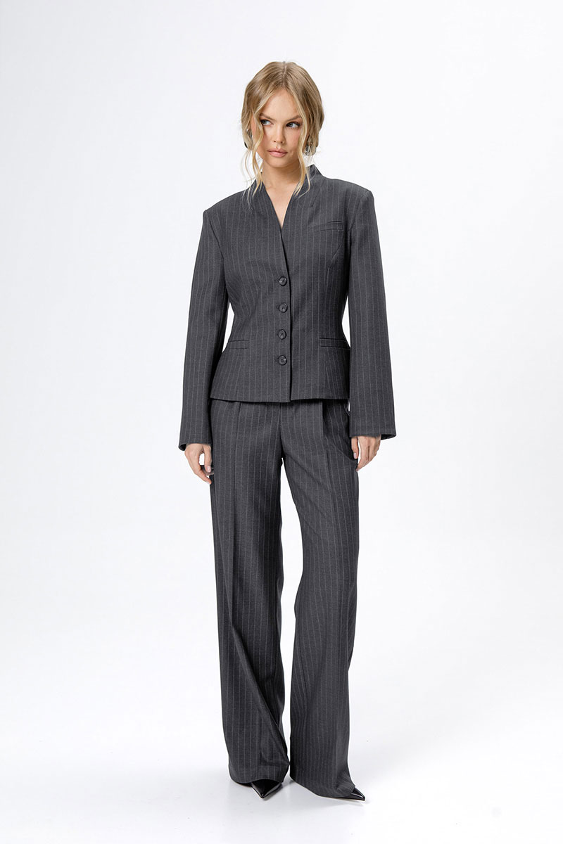 Костюм-двойка из приталенного жакета со съемным шарфиком и широких прямых брюк.