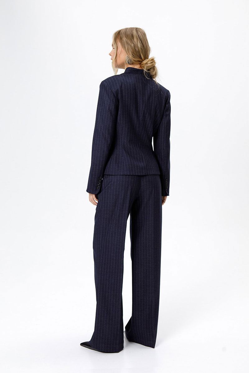 Костюм-двойка из приталенного жакета со съемным шарфиком и широких прямых брюк.