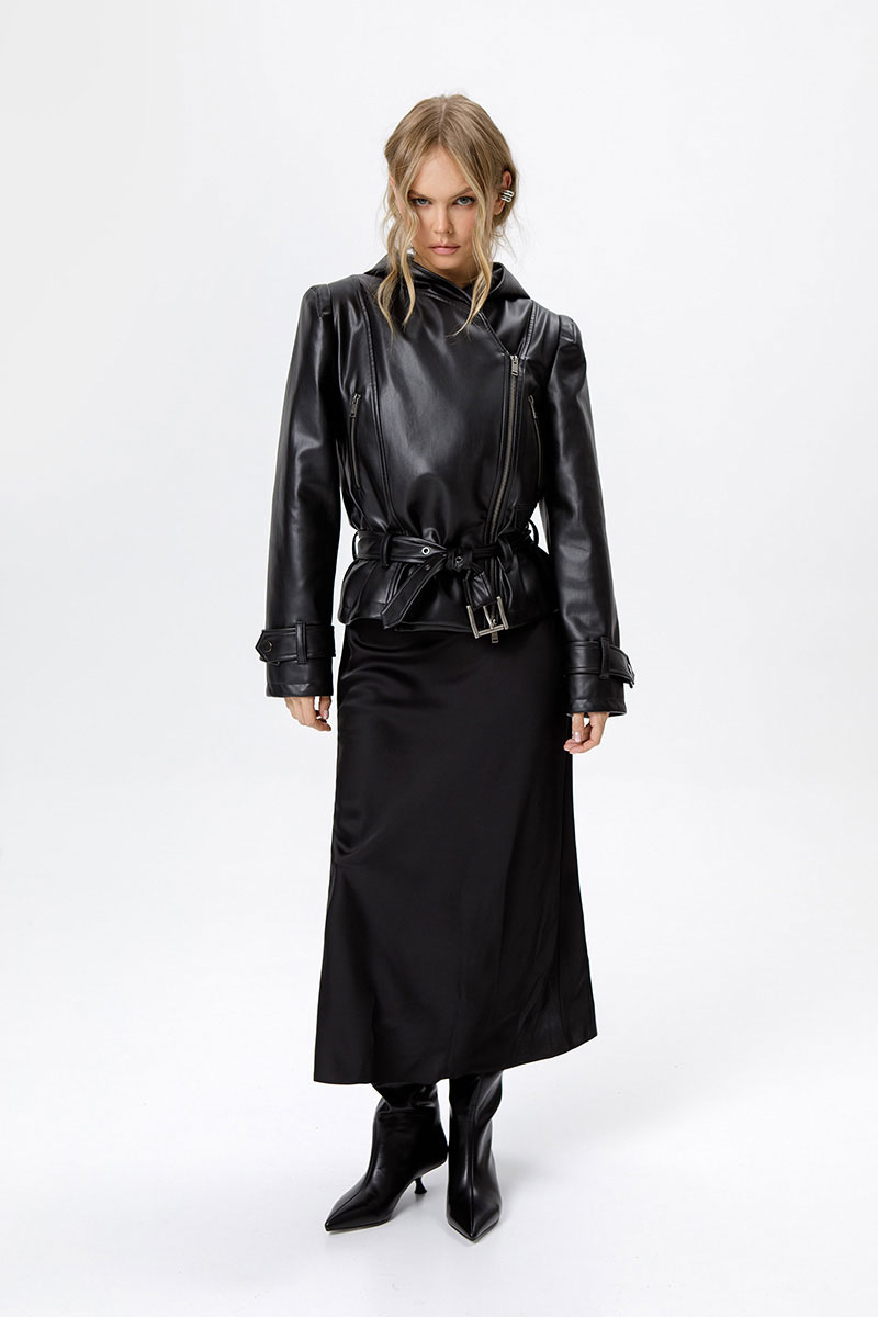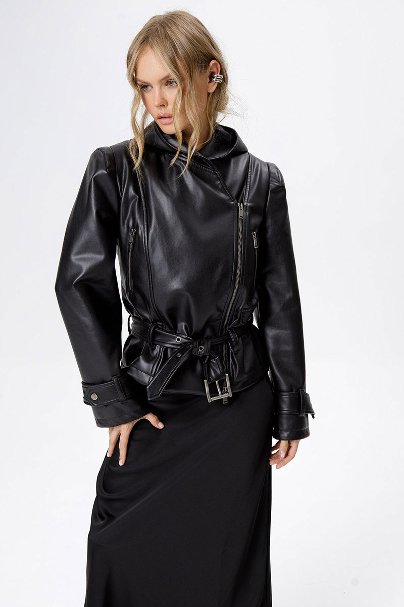 Куртка из экокожи с капюшоном и акцентными плечами.