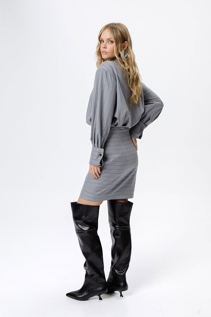 Детали: платье полуприлегающего силуэта, отрезное по талии с напуском, нижняя часть переда с ассиметричными складками, нижняя часть спинки с талиевыми вытачками, верхняя часть платья со складками на талии, рубашечный воротник, застёжка на потайную планку с пуговицами, потайная молния в боковом шве, рубашечный покрой рукава с расширенным плечом, широкие манжеты. Юбка платья на подкладке