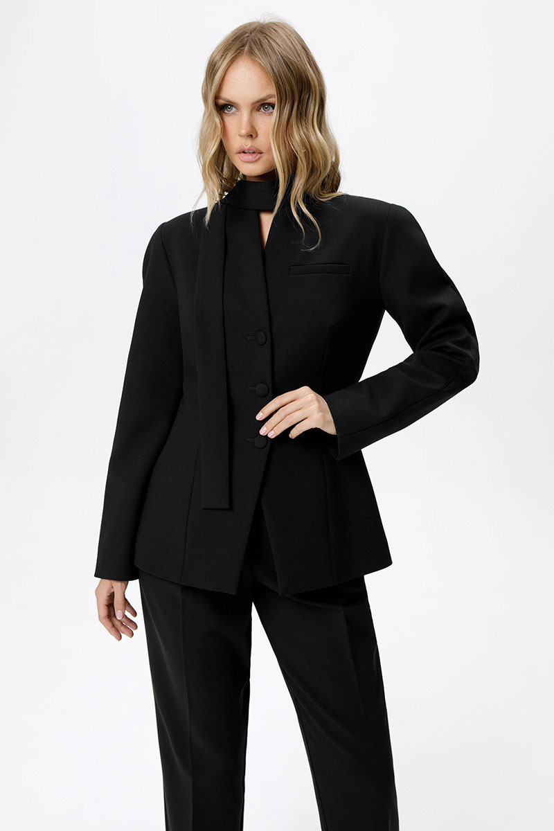 Костюм-двойка из приталенного жакета с акцентными плечами и укороченных классических брюк со стрелками.