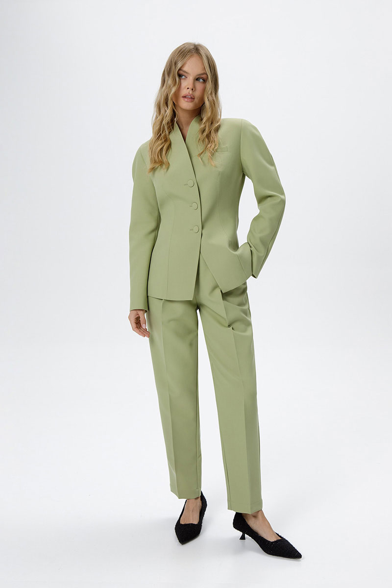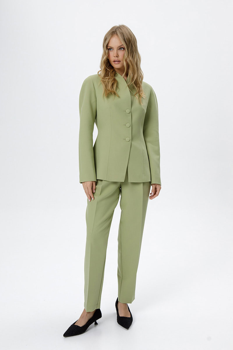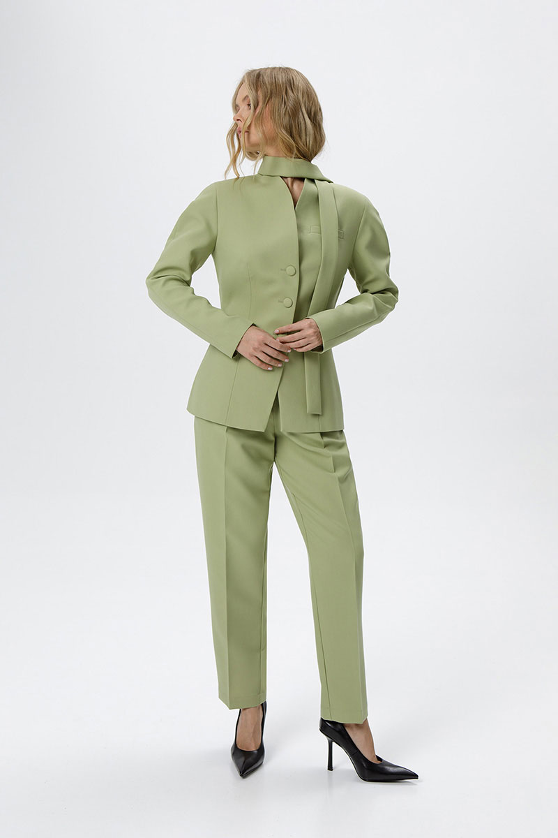 Костюм-двойка из приталенного жакета с акцентными плечами и укороченных классических брюк со стрелками.
