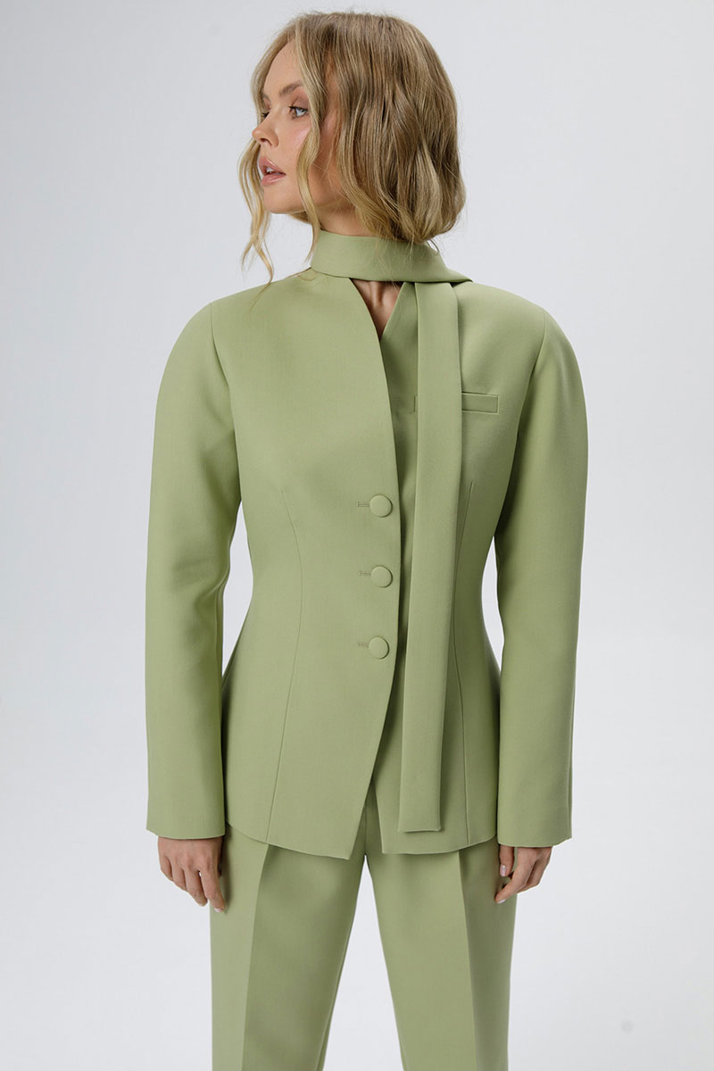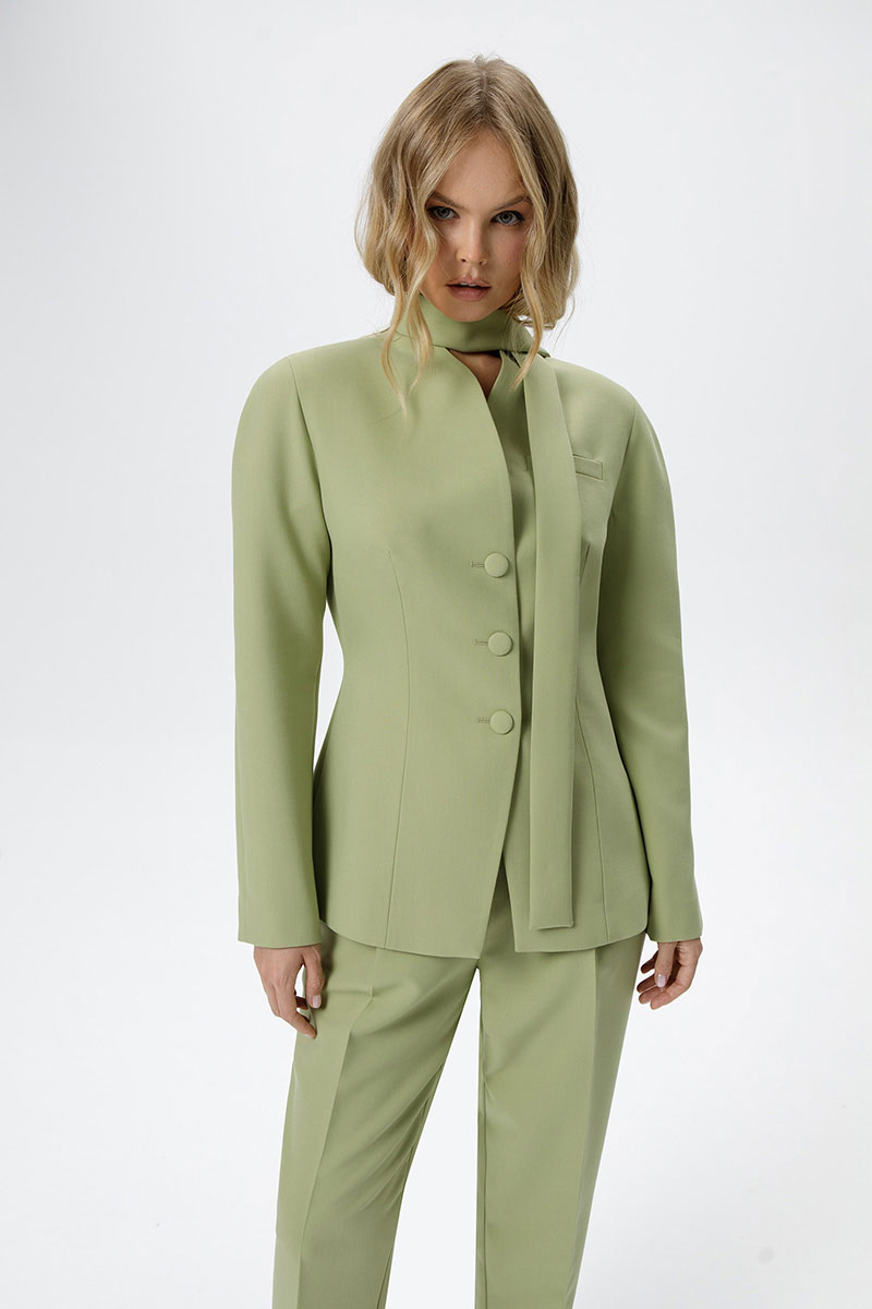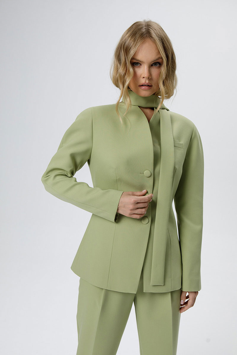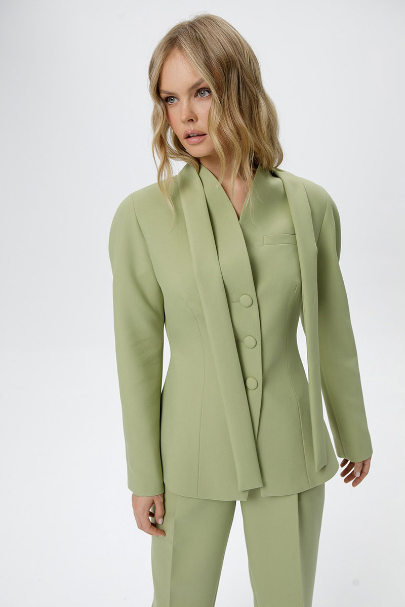 Костюм-двойка из приталенного жакета с акцентными плечами и укороченных классических брюк со стрелками.