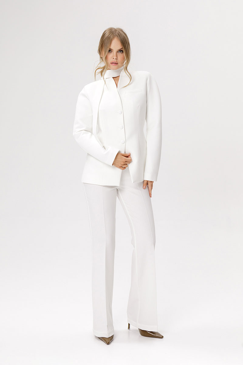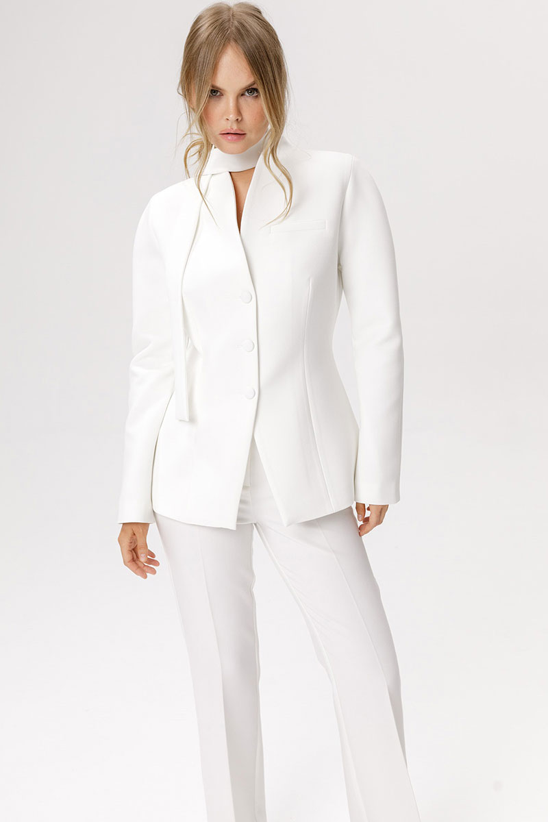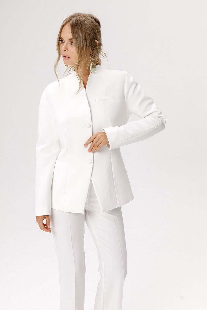 Приталенный жакет с акцентными плечами и воротником-стойкой.