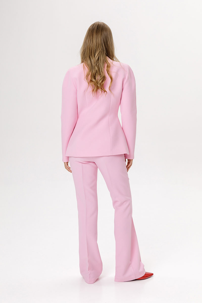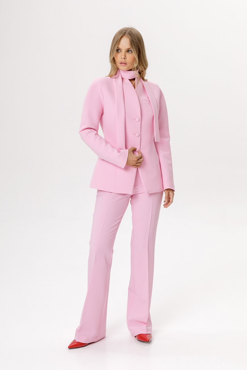 Приталенный жакет с акцентными плечами и воротником-стойкой.