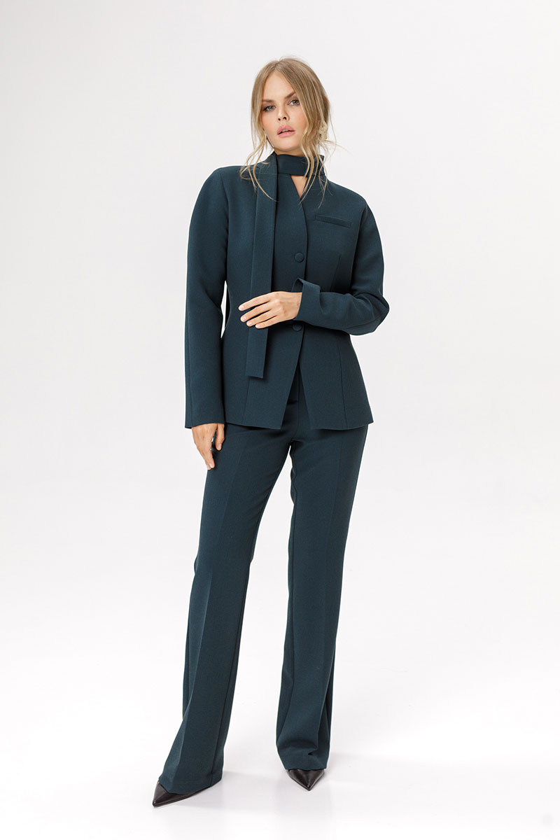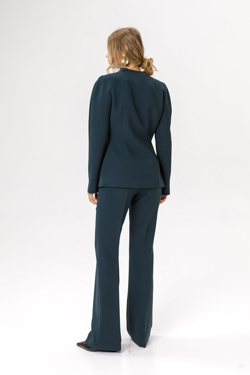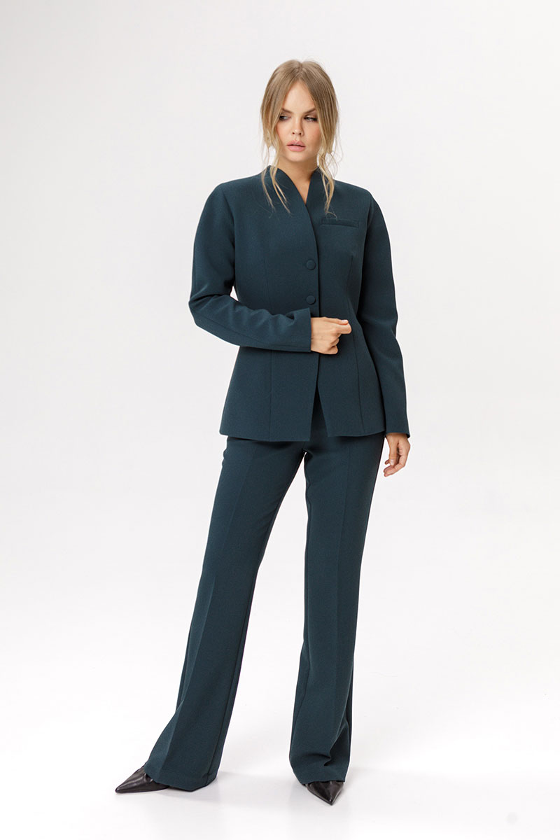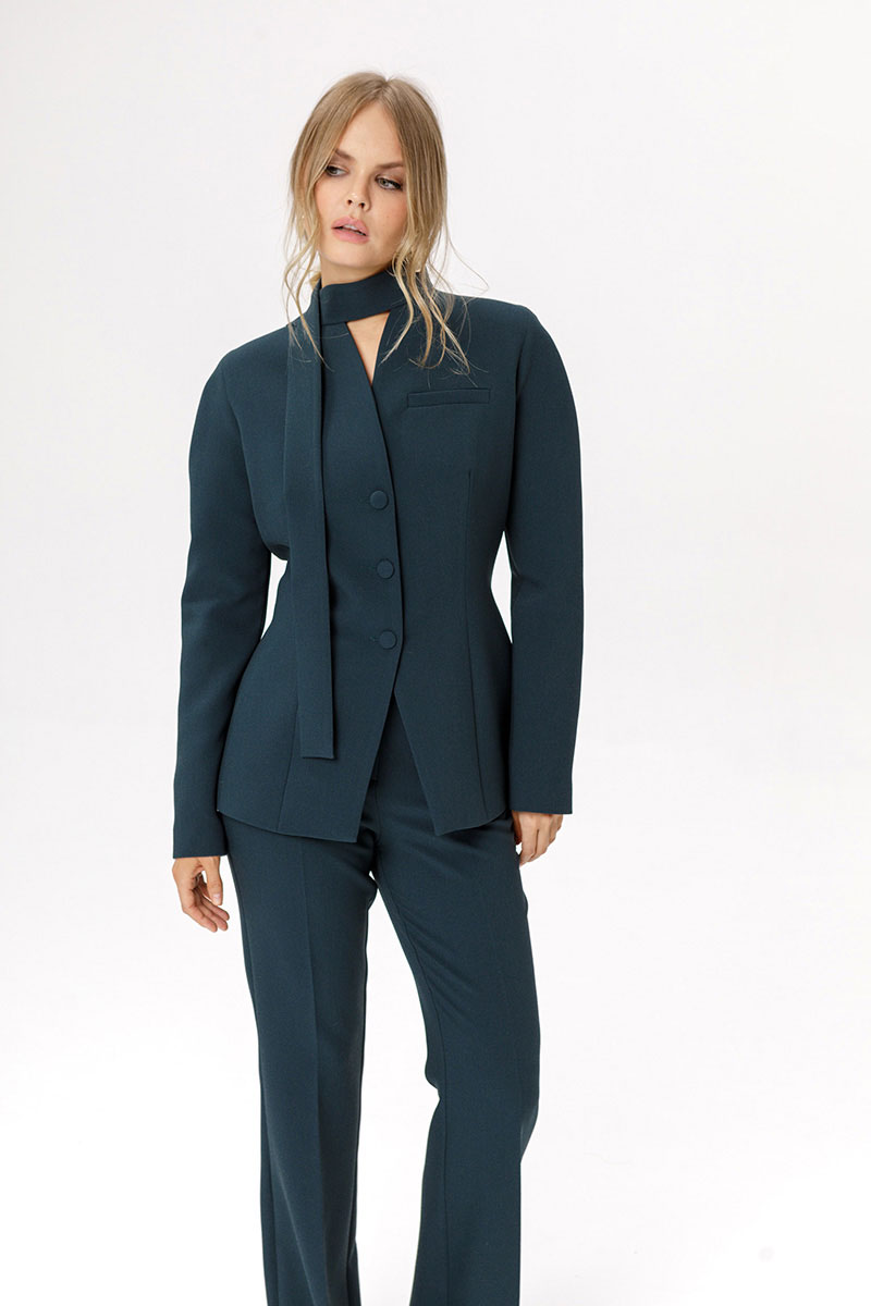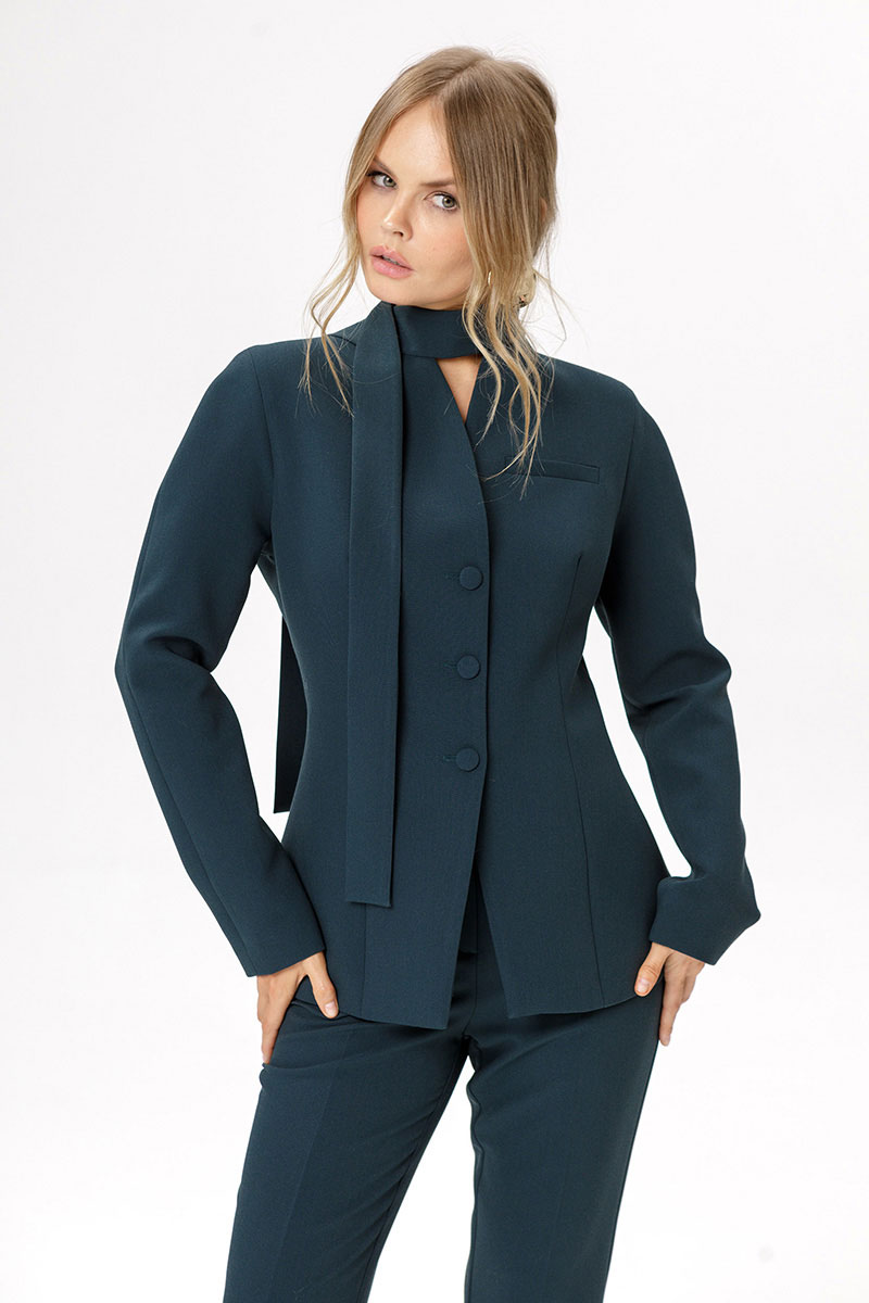 Приталенный жакет с акцентными плечами и воротником-стойкой.
