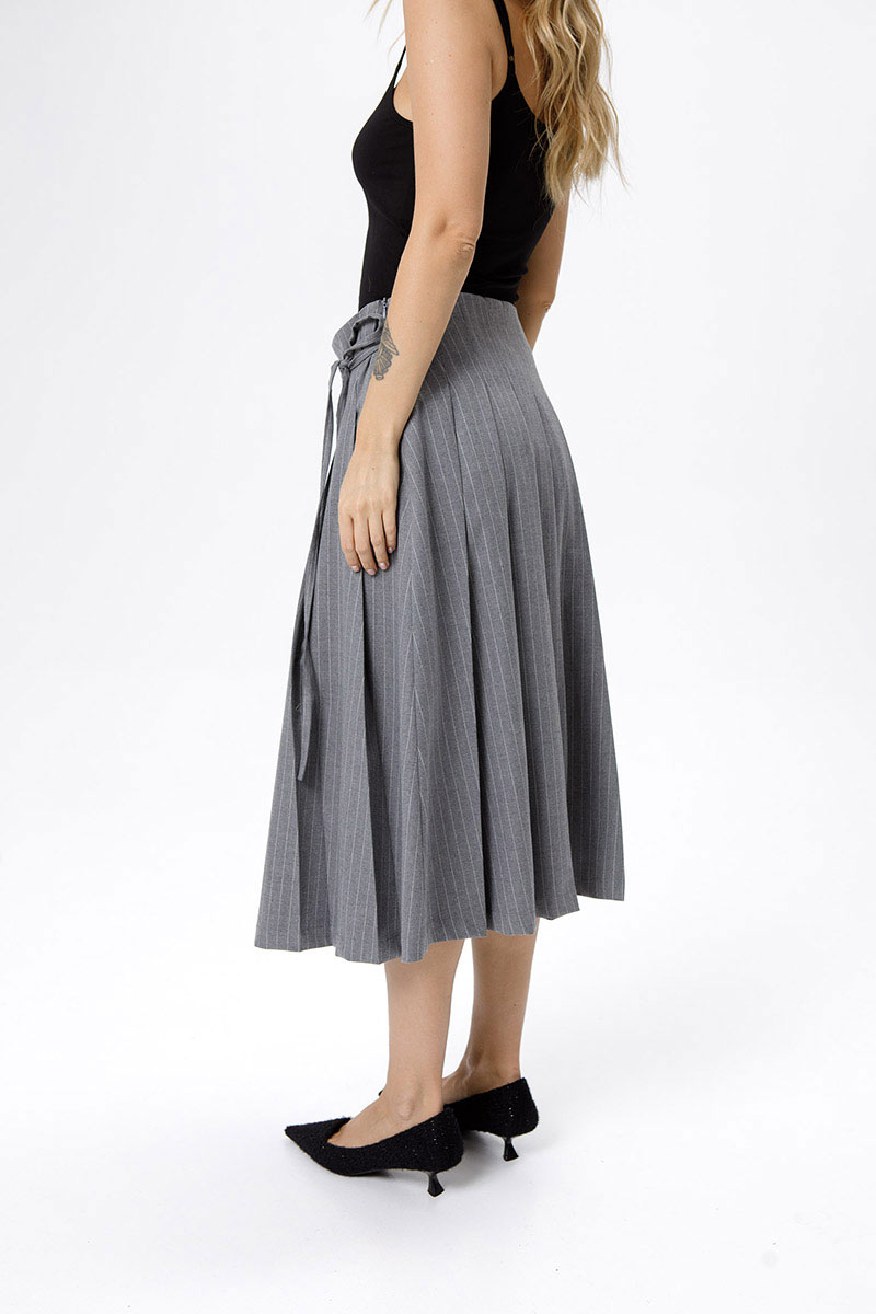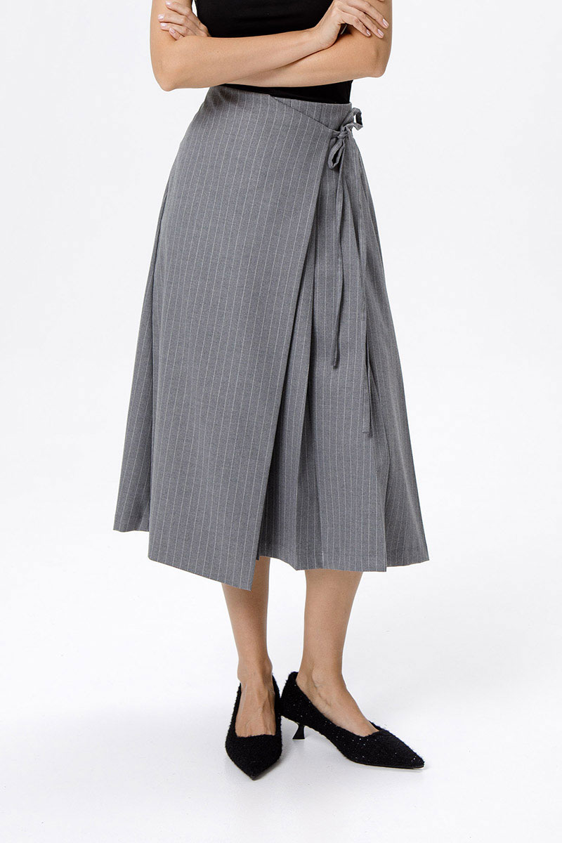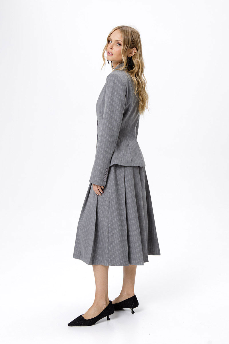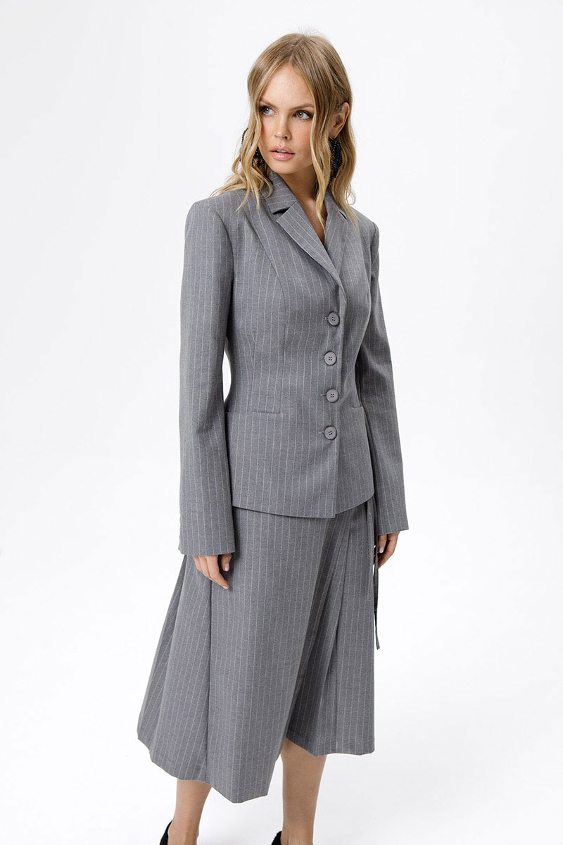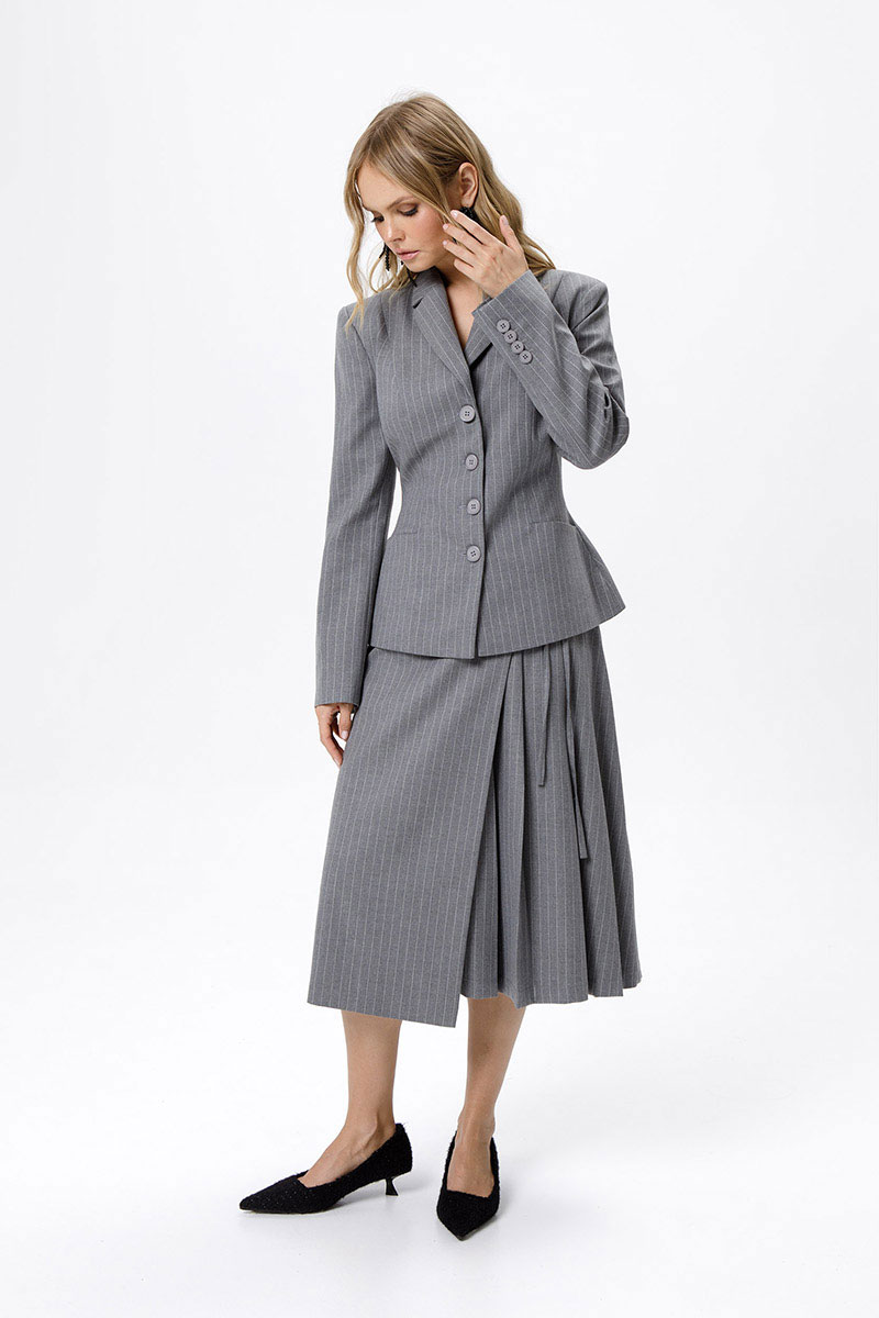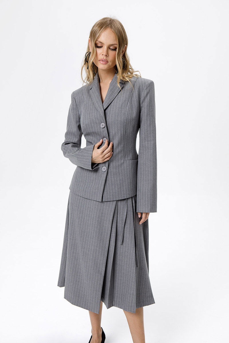 Костюм-двойка из укороченного приталенного жакета с акцентными карманами и асимметричной юбки со складками.