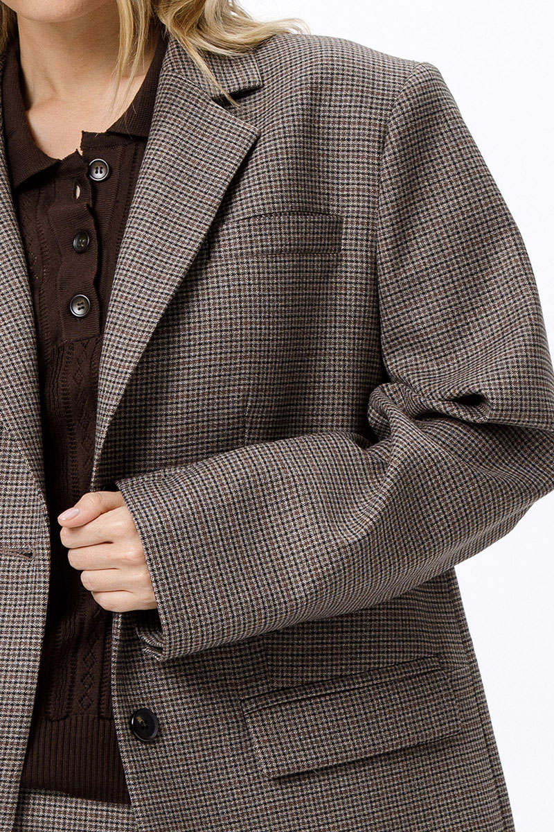 Костюм-двойка из оверсайз жакета и мини-юбки из текстильной ткани в клетку.
