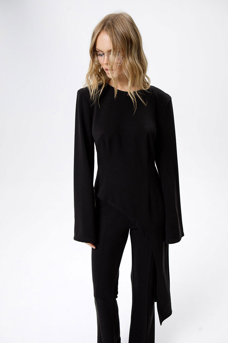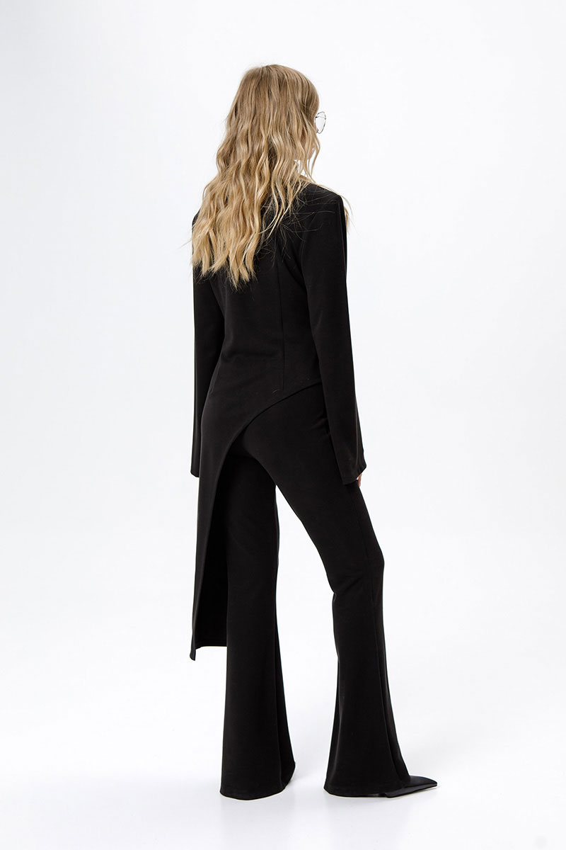 Трикотажный костюм-двойка из асимметричной туники и облегающих брюк-клеш.