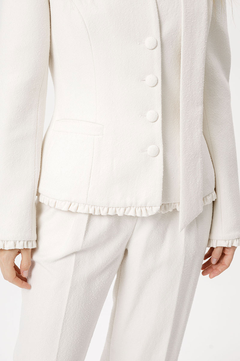 Костюм-двойка из приталенного жакета со съемным шарфиком и укороченных классических брюк со стрелками из фактурной ткани «букле».