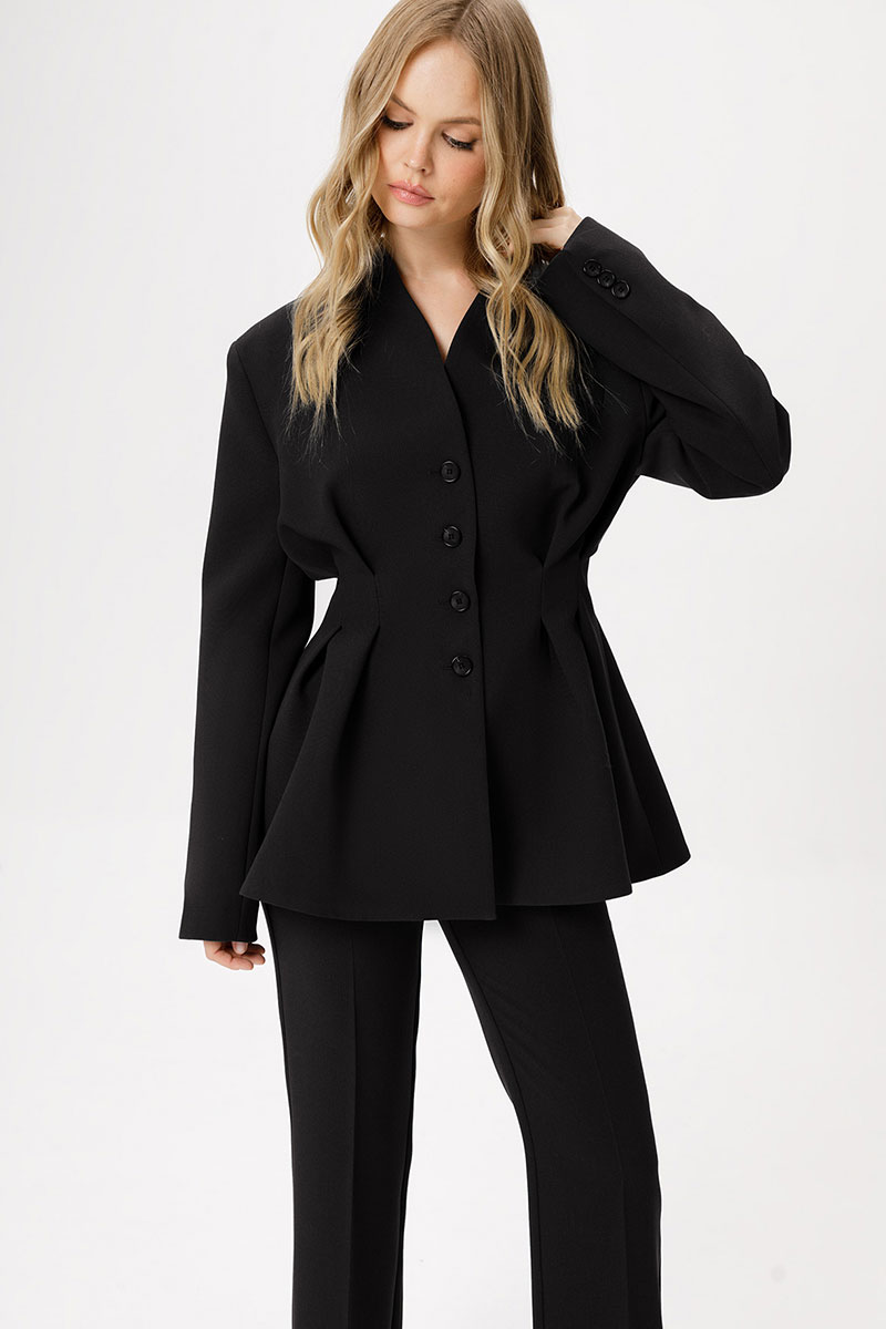 Приталенный жакет со складками и расширенными плечами. Детали: полуприлегающий силуэт с расширенными плечами, цельнокроеный воротник-стойка, застежка на петли и пуговицы, рукава втачные двушхшовные, жакет на подкладке.
