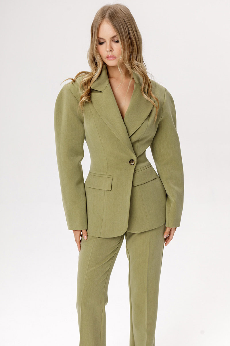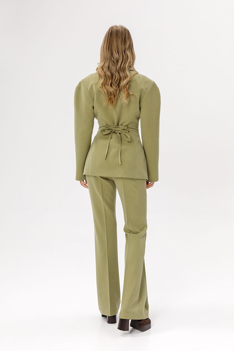 Детали: притачной пояс со шлевками, передние половины с заутюженными стрелками, застежка на молнию и потайные крючки, боковые карманы. Задние части брюк с вытачками и заутюженными стрелками. Пояс брюк без резинки.