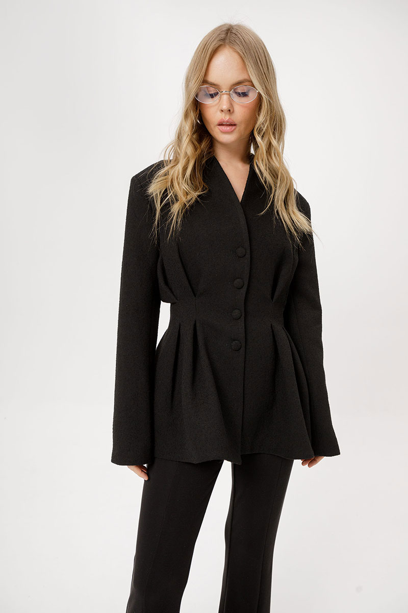Приталенный жакет со складками и расширенными плечами из фактурной ткани «букле».