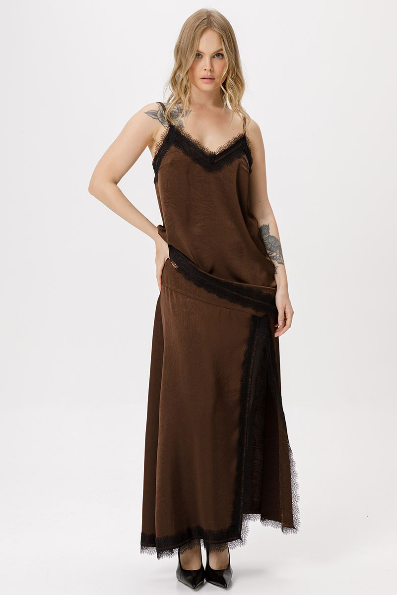 Костюм-двойка в бельевом стиле из асимметричного топа и юбки с кружевом.